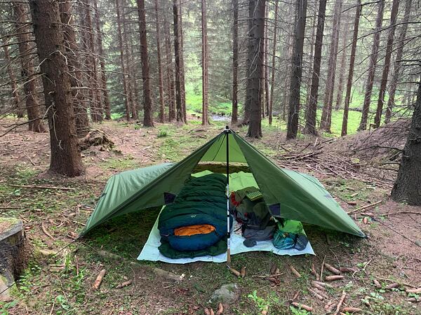 Což jsem si ostatně také vyzkoušel. Zapříčinila to moje lenost. Na konci dne jsem byl unavený a odbil jsem vypnutí tarpu, ten se během noci pod vlhkostí prověsil a já se probudil s mokrýma nohama.