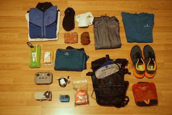Na horské běhy pobalím do 20l kapsy a další kapsiček vše co potřebuji (jen boty rovnou na nohy)