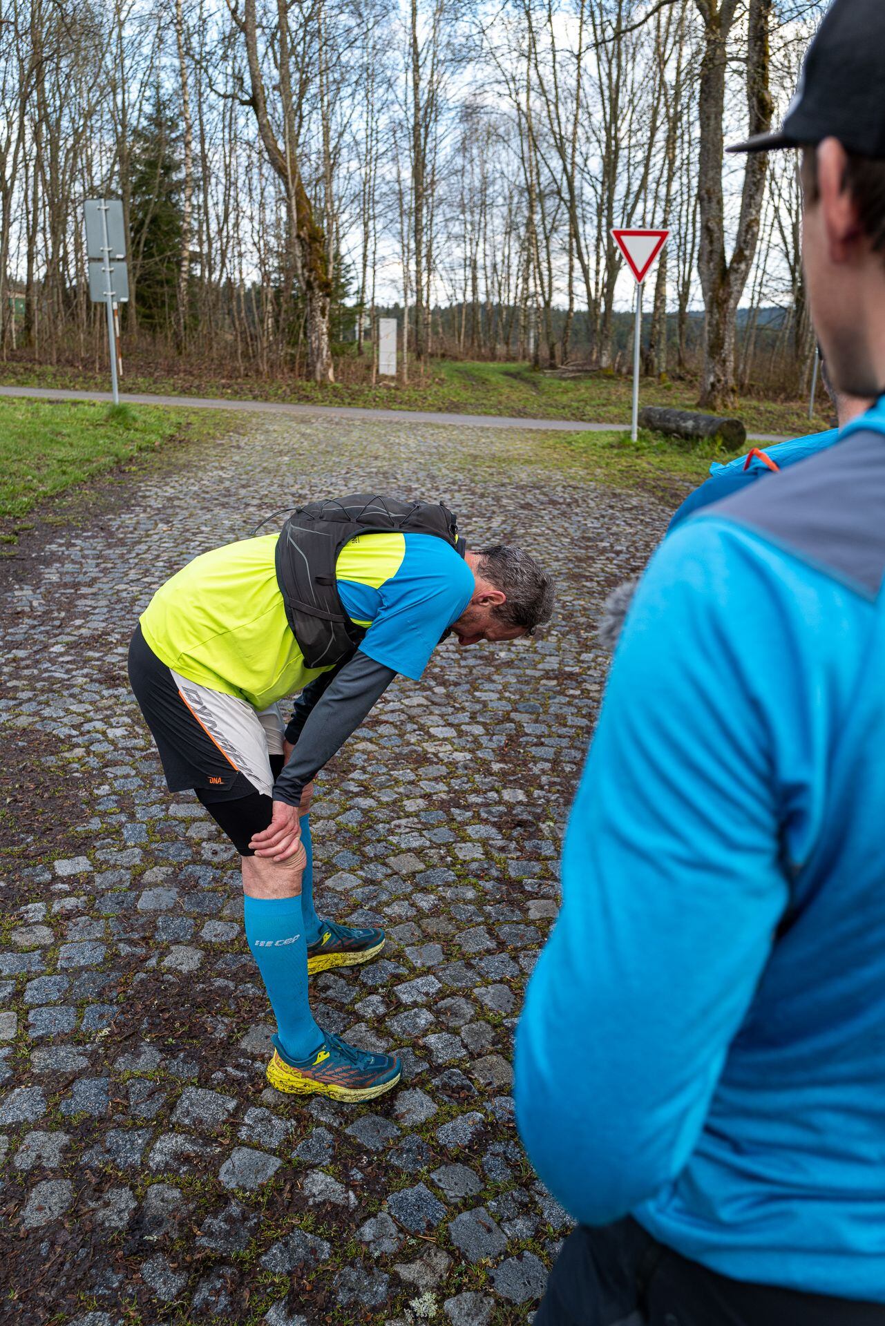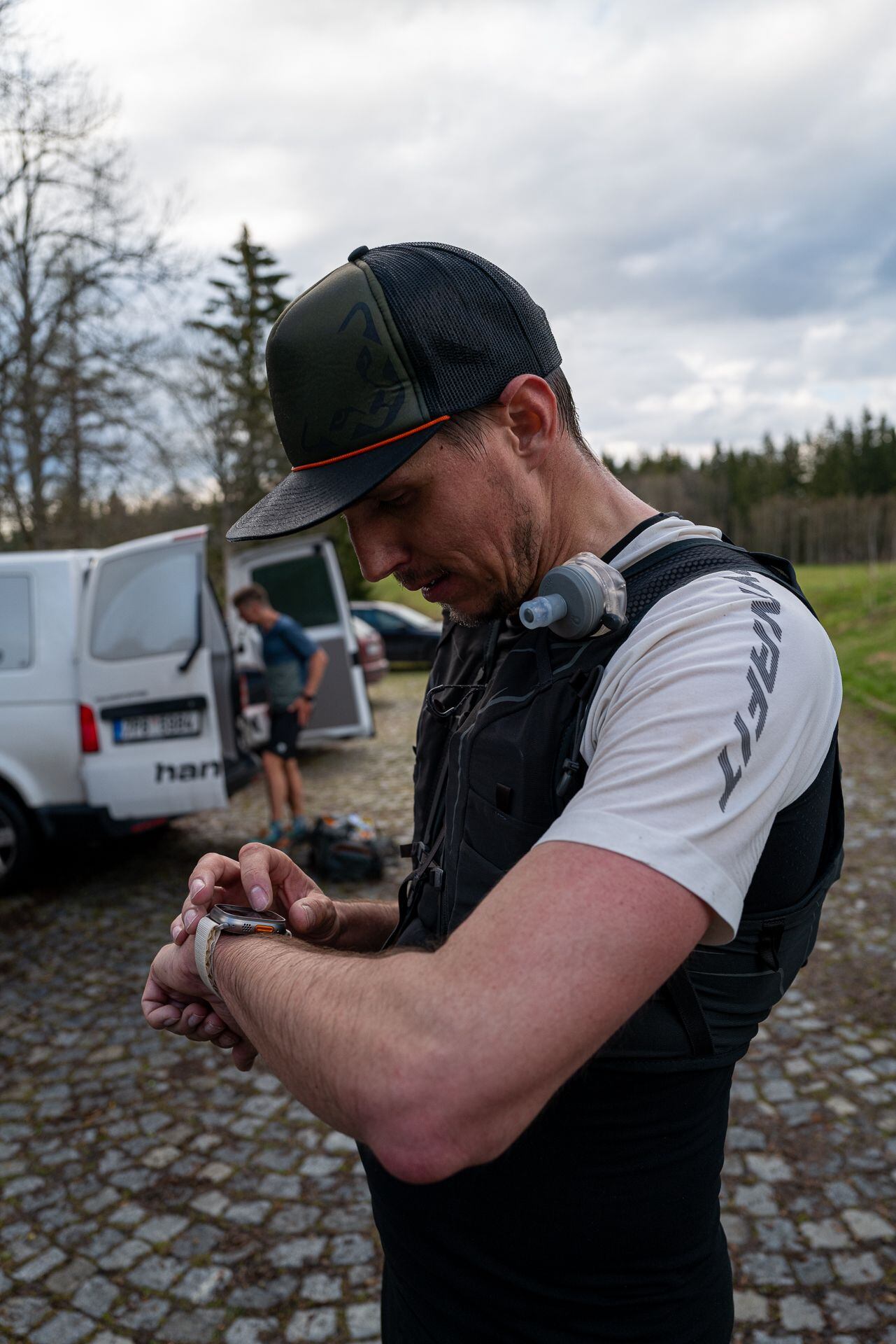 Díky tomu, že nebylo třeba spěchat, tak jsme si to udělali hezký i co se týče stravování. Na několika domluvených místech nás čekal Lukáš s Áďou s občerstvením. Když byla možnost supportu, tak jsem využil tuhou stravou (rohlík, salám, sýry). Když jsme byli delší dobu na trase sami, tak jsem doplňoval energii gely od Enervitu. Do flašek do vesty jsem si vždy dával ionťák. Po každém doběhu jsem si namíchal regenerační drink, rovněž od Enervitu. To už delší dobu považuju za zázrak (obzvlášť v těžších fázích příprav na závody).