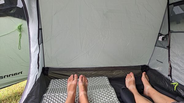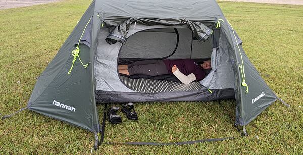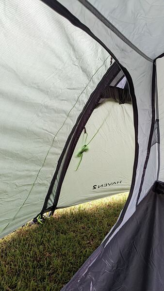 Po postavení stanu Hannah Haven 2 jsem byla překvapena jeho prostorností. Do ložnice se pohodlně vejdou 2 osoby i s batohy. Také prostor „předsíněk“ (apsid) je dostatečně velký na boty a nějaké věci jako batůžek nebo drobnější krosnu. V ložnici se dá snadno posadit (má výšku 105 cm), takže je komfortní i na delší kempování na jednom místě.