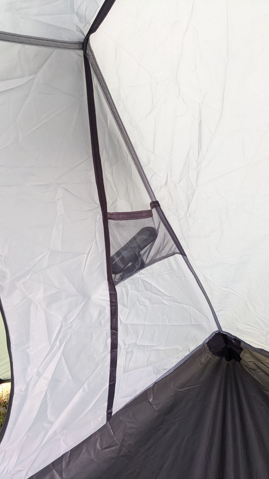 Vnitřek stanu je vybaven kapsičkami, do kterých se vejdou drobné osobní věci. Jsou umístěny v rozích, v polovině výšky stanu, takže při pohybu z nich díky tomu věci nevypadávají. Nahoře jsou dvě očka, na které se dají pověsit lampičky nebo se dají použít k natažení provázku na věci. Já využila možnosti zavěšení lucerničky.