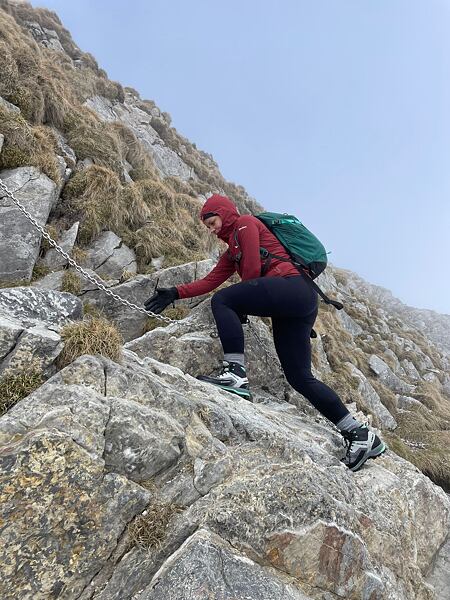 Při výstupu v horách jsem měla možnost pod vrcholem otestovat její odolnost vůči oděru. Bunda vydržela bez známek poškození i přímý dotek se skálou, při jištění řetězy a občasné nucené obejmutí skály. Po zběžné kontrole nebyla na bundě sebemenší vada, což beru jako velké plus. Nikdo nechce mít oděv, se kterým se na horách bude bát čehokoliv dotknout.