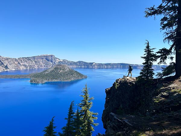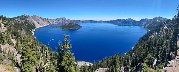 Po první třetině jsme došli do Crater Lake National Park. Nádherný kus země, kde je středobodem stejnojmenné jezero Crater Lake. Jezero vzniklo před více než 7 000 lety po erupci sopky Mazama a jejímu následnému zřícení. Crater Lake je skoro 600 metrů hluboké a uprostřed se nachází malý ostrůvek Wizard Island, který podtrhuje jedinečnost tohoto jezera. Na vysokém břehu s nádherným výhledem jsme si dali dlouhý oběd a… šli dál.
