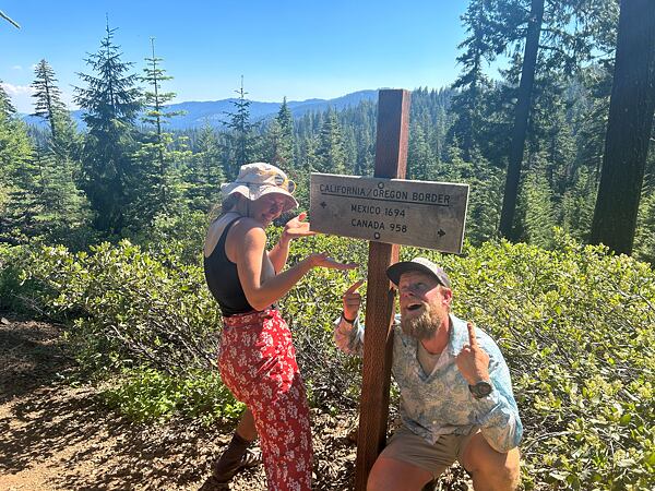 Po „dlooouuuhých“ 115 dnech jsme přešli přes státní hranici CA/OR (míle 1 692,8)! Symbolicky v první den nového měsíce. 1. července 2023. Na oslavu jsme měli malé flaštičky s rumem. To muselo být.