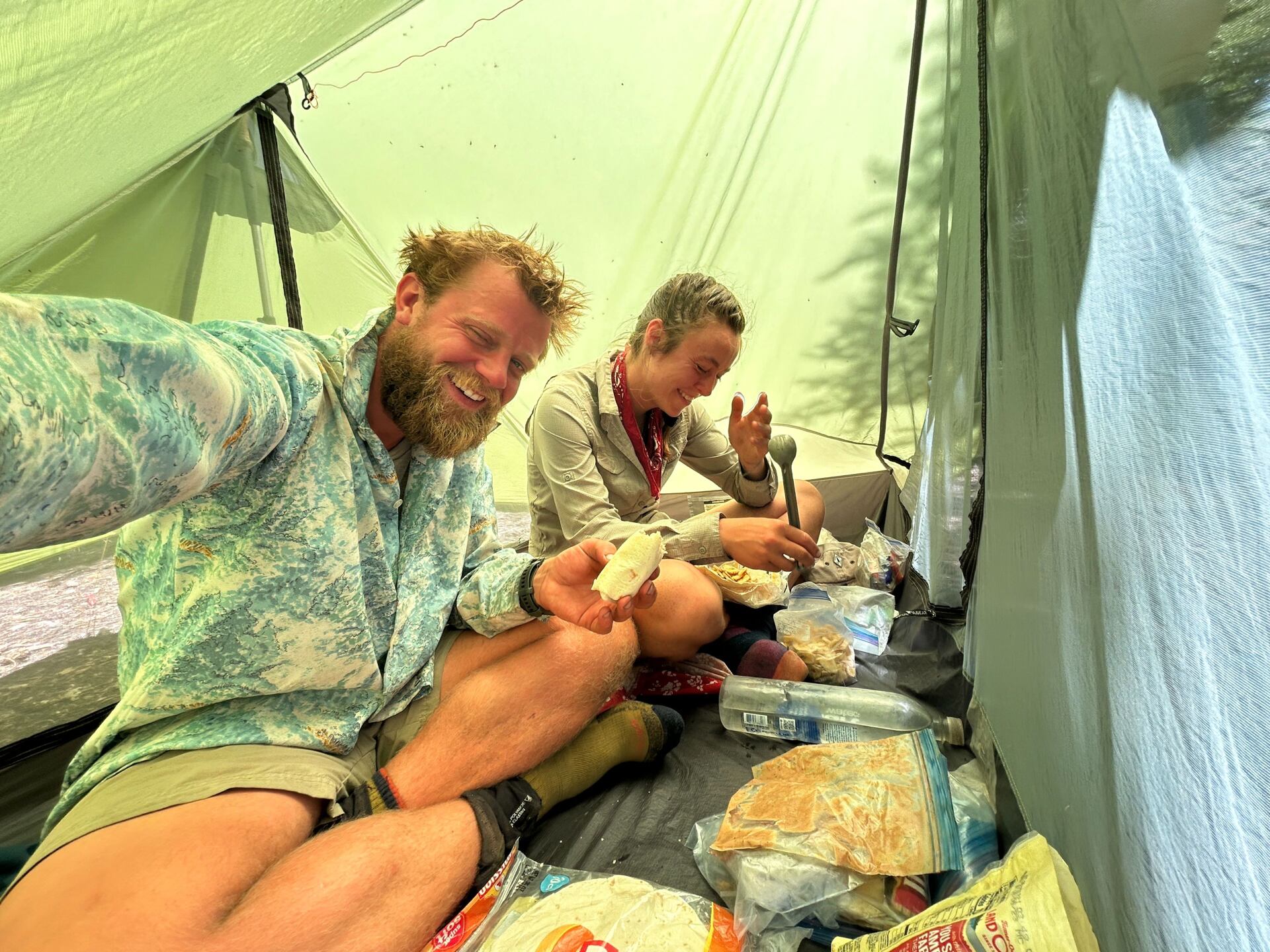 Ranní balení věcí ve stanu, síťky na hlavě, stavění stanu, abychom se v klidu naobědvali, pauzy během dne „stále v pohybu“ a večery trávené opět v bezpečí stanu. Šílené! V životě jsem nic takového nezažil. Dokonce mi přišlo, že některým komárům ani nevadilo, že jsme byli nastříkaný repelentem. Štípanců jsme na tělech měli tolik, že bychom je ani nedokázali spočítat.