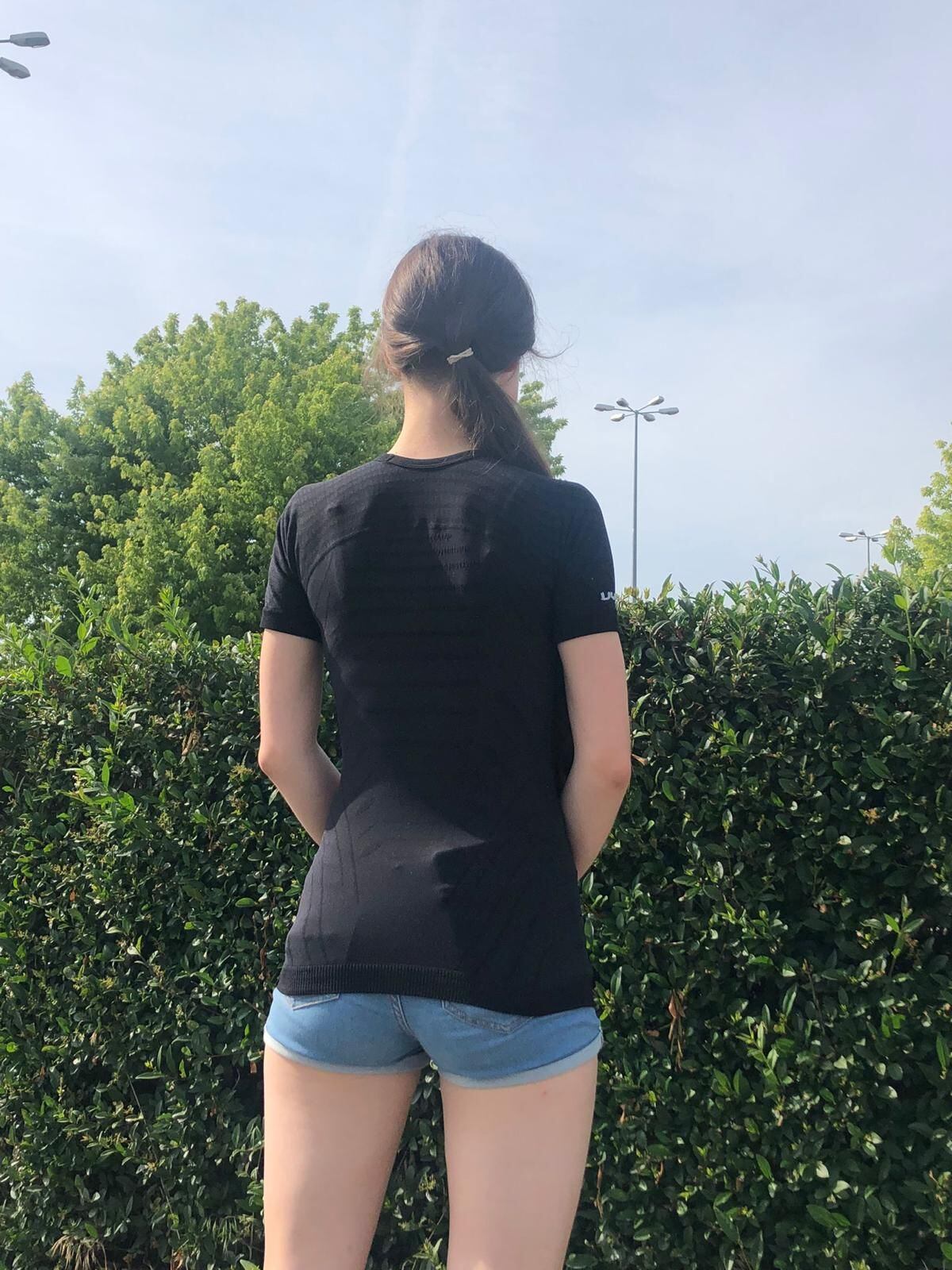 Je pletené těsně na tělo. Při vybalení proto opravdu vypadá spíše jako dětské, ale při oblečení se natáhne. Padne jako druhá kůže, aniž by někde škrtilo, díky čemuž výborně odvádí pot i z těžko dostupných míst. Nestane se, že by vám stékaly čůrky potu v podpaží nebo pod prsy, jak se to tak občas stává. Látka je na těle tak těsně, že pot zachycuje a díky kombinaci materiálu Natex s technologiemi Coolvent a 4way Ventilation rovnou odvádí.