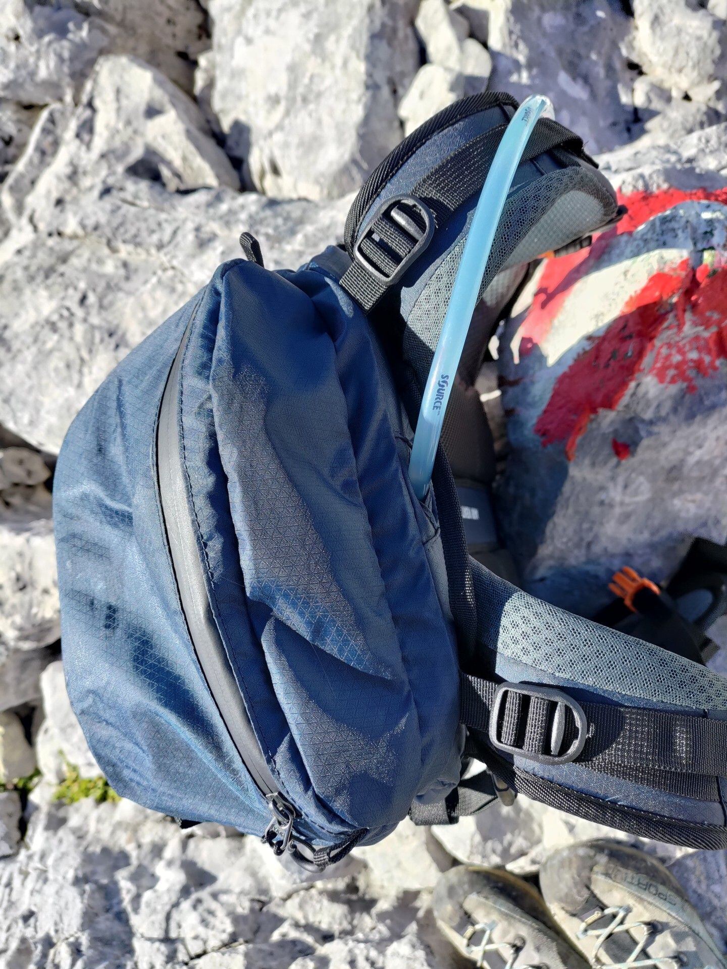 Bederní popruh má na jedné straně elastickou kapsu a na druhé materiálové poutko, takže ani karabiny a presky se na batohu neztratí. Oka v horní a přední části batohu, do kterých lze napasovat síťku na helmu, můžete samozřejmě využít i jinak a provléct jimi, co uznáte za vhodné – já takto například na karabině nosívám zvenčí mokré sandály po brodění řek.