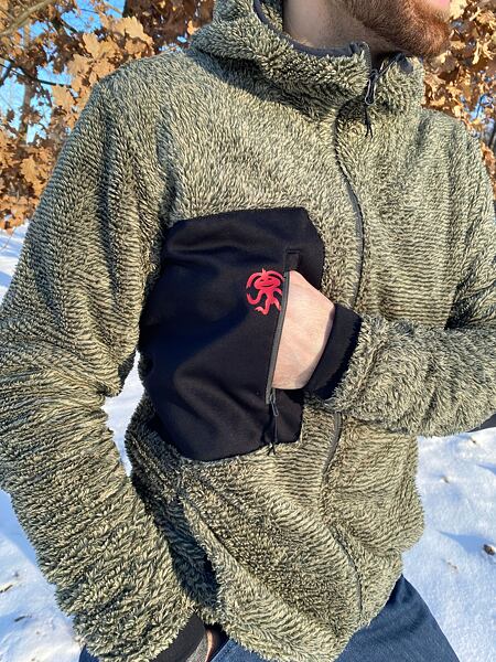 Náprsní kapsička je opatřena kvalitním YKK zipem. Na první pohled se zdá, že se toho do ní příliš nevleze, ale zdání klame. Celá kapsa vede až k boku mikiny a její velikost odpovídá rozměru roztažené pánské (lezecké) dlaně. Design kapsičky a celkově i mikiny doplňuje malé vkusné logo „Rafikáčka“.