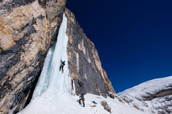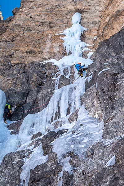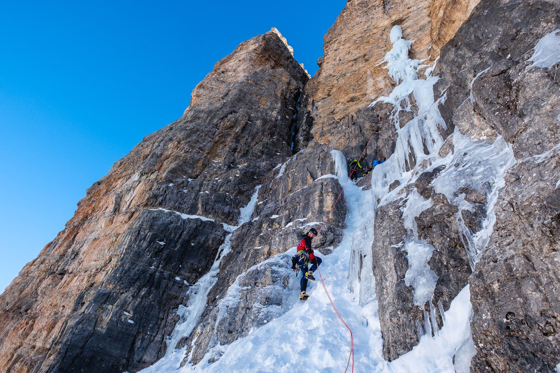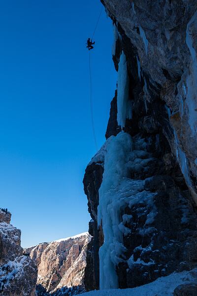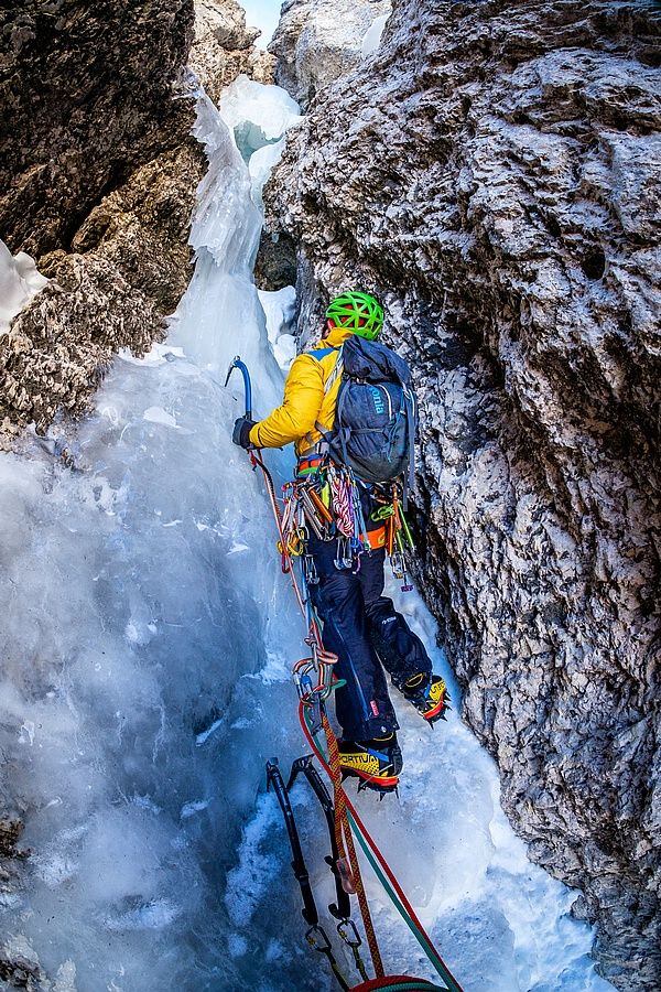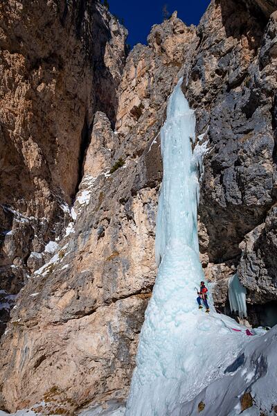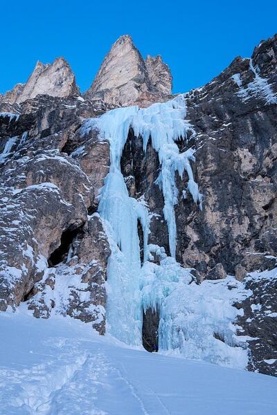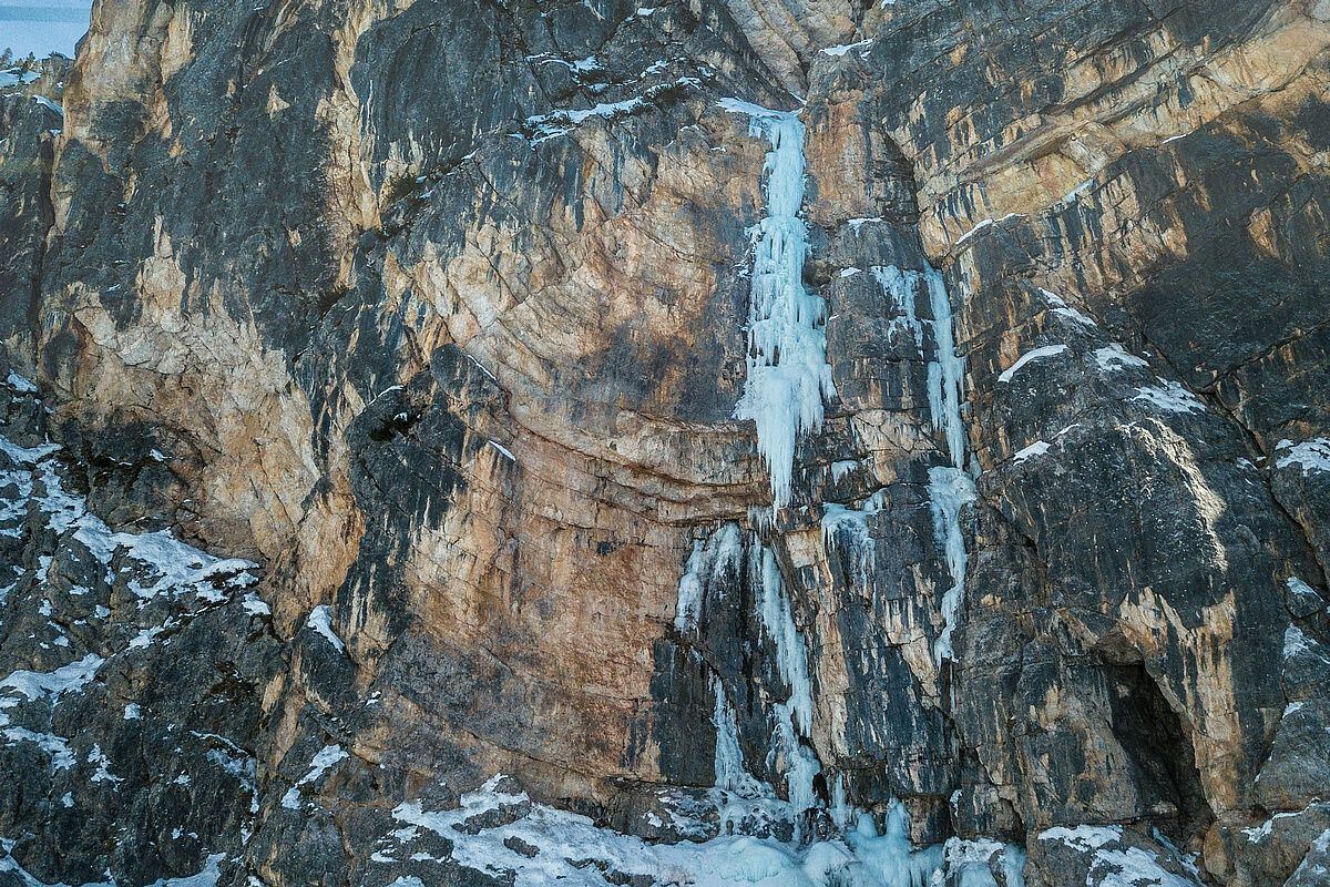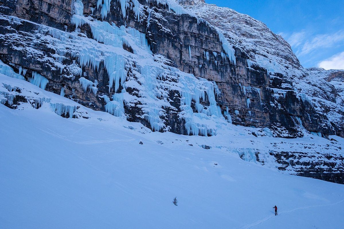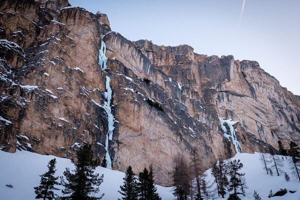 Val Travenanzes severně od Cortiny vyžaduje delší přístup, ale odměnou je unikátní atmosféra. V odlehlém údolí se za dobré podmínky formují dlouhé a velkolepé linie, jednou z nich je například Sogno Canadese (200 m, WI 5).