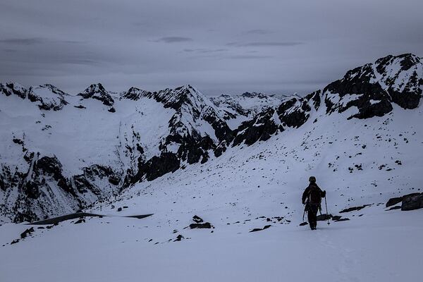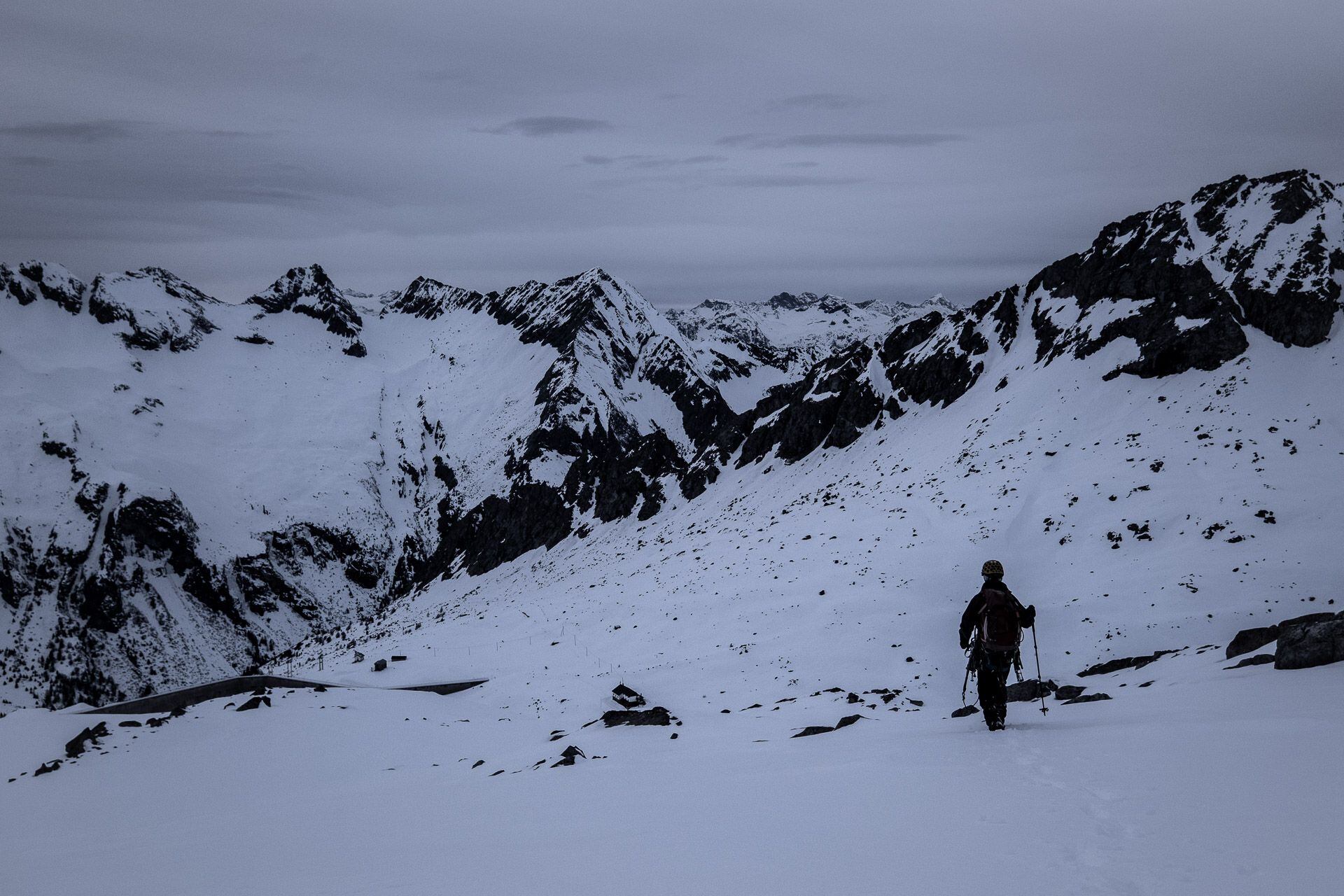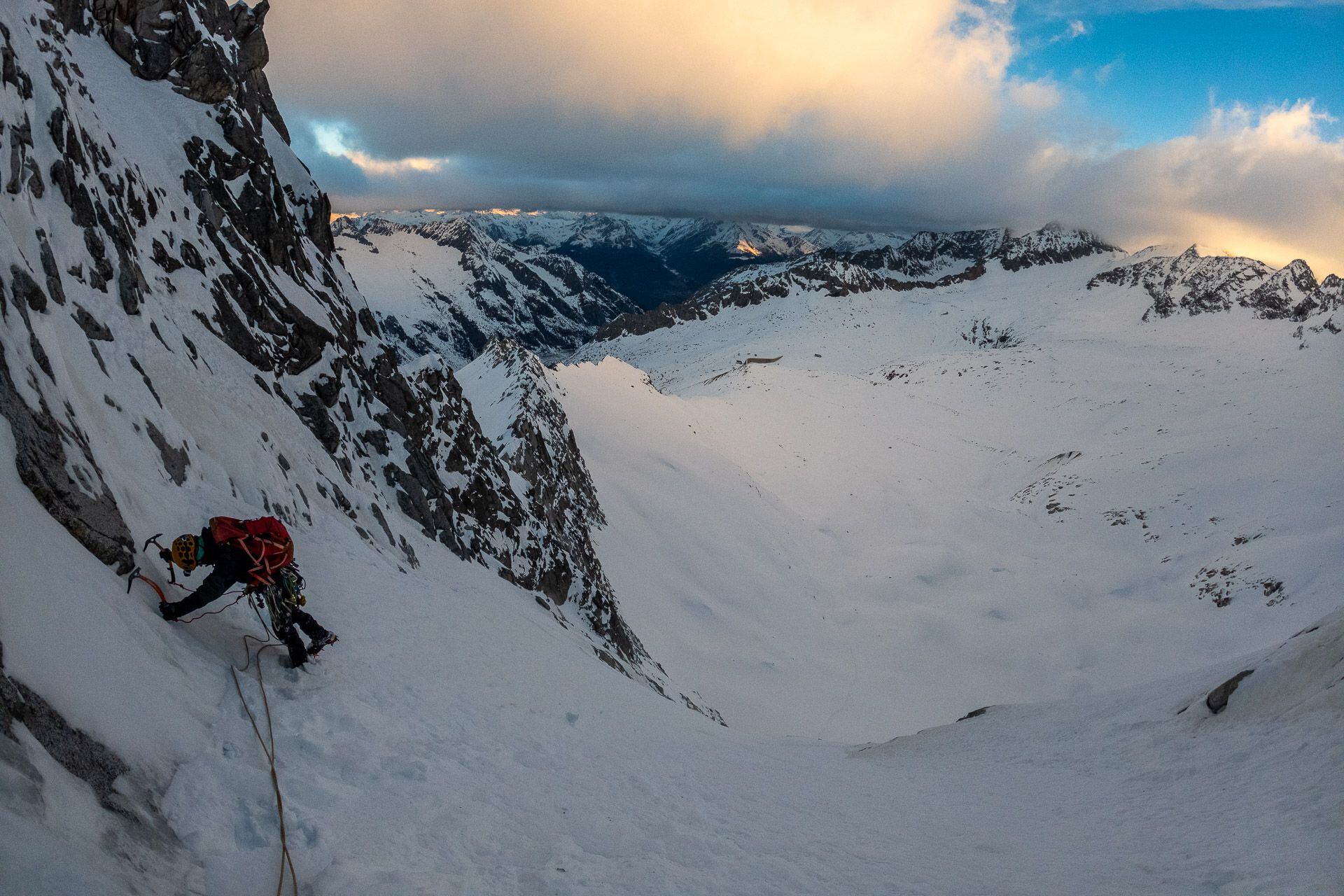 Hlubokým sněhem šlapeme na východ do sedla Inglesi. Tam naštěstí nacházíme slaňovací dráhu, která nám dost usnadní průstup strmým žlabem plným prašanu. Zato dole už je to jen a jen na našich nohách. Po více než 4 hodinách otevíráme dveře winterraumu s posledními zbytky světla.