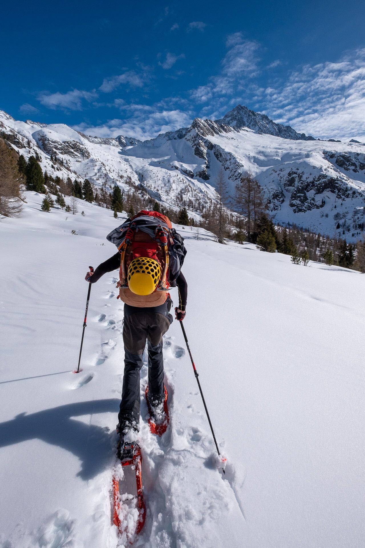 I když se výstup touto linií nepočítá mezi nějaké alpské extrémy zahrnující těžké lezení a bivaky ve stěně, užili jsme si řádné dobrodružství hned od začátku. Úzká silnička vedoucí od městečka Temú se postupně mění na šotolinu. Kameny se zvětšují, sklon přibývá. Ledová plotna v druhé serpentině nám dává jasnou stopku. Dál už jdeme po svých. Lyže jsme po konzultaci s místňákem Claudiem nechali doma a na batohy připínáme sněžnice. Tahle kombinace se v aktuálních podmínkách ukáže být nejlepší volbou.