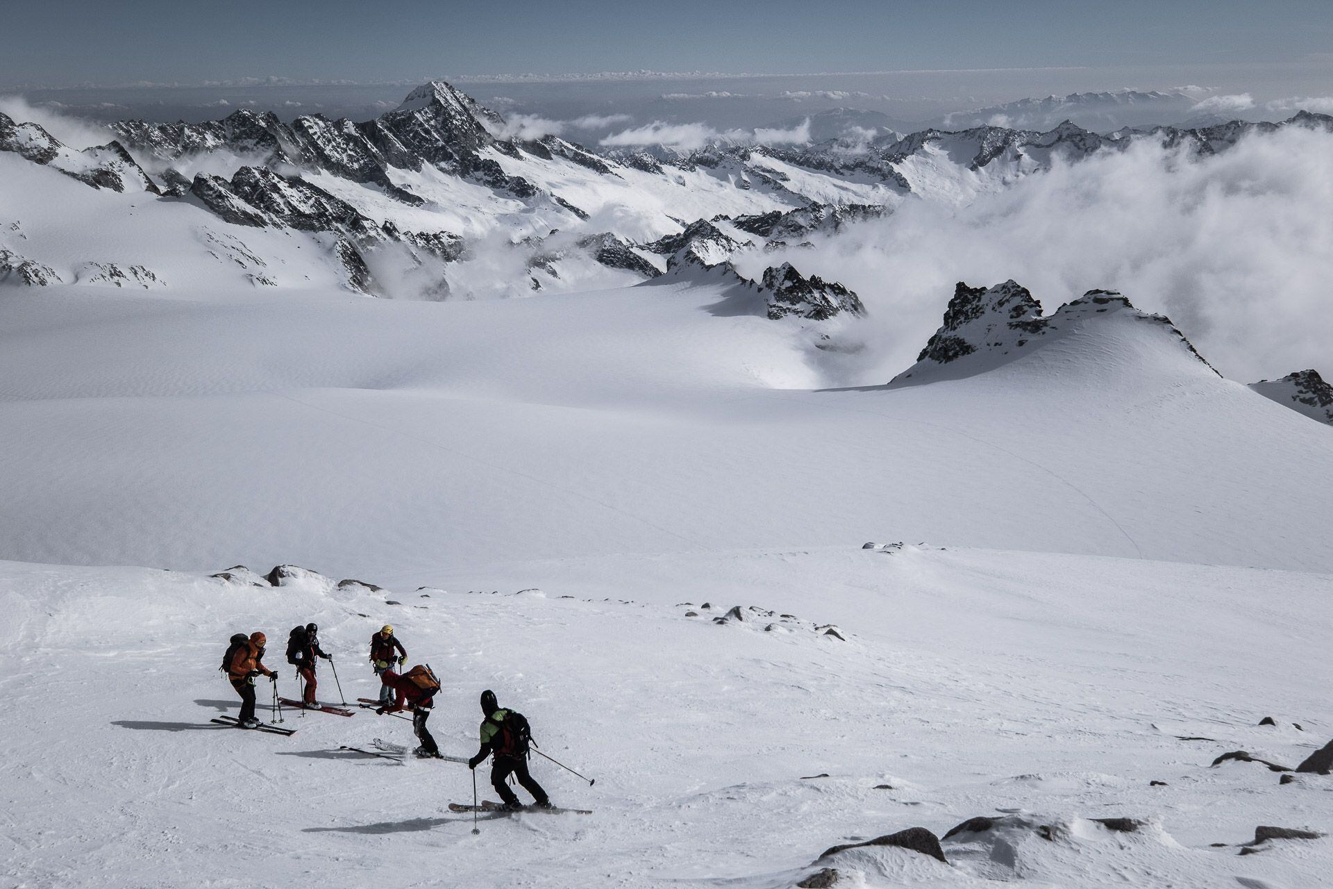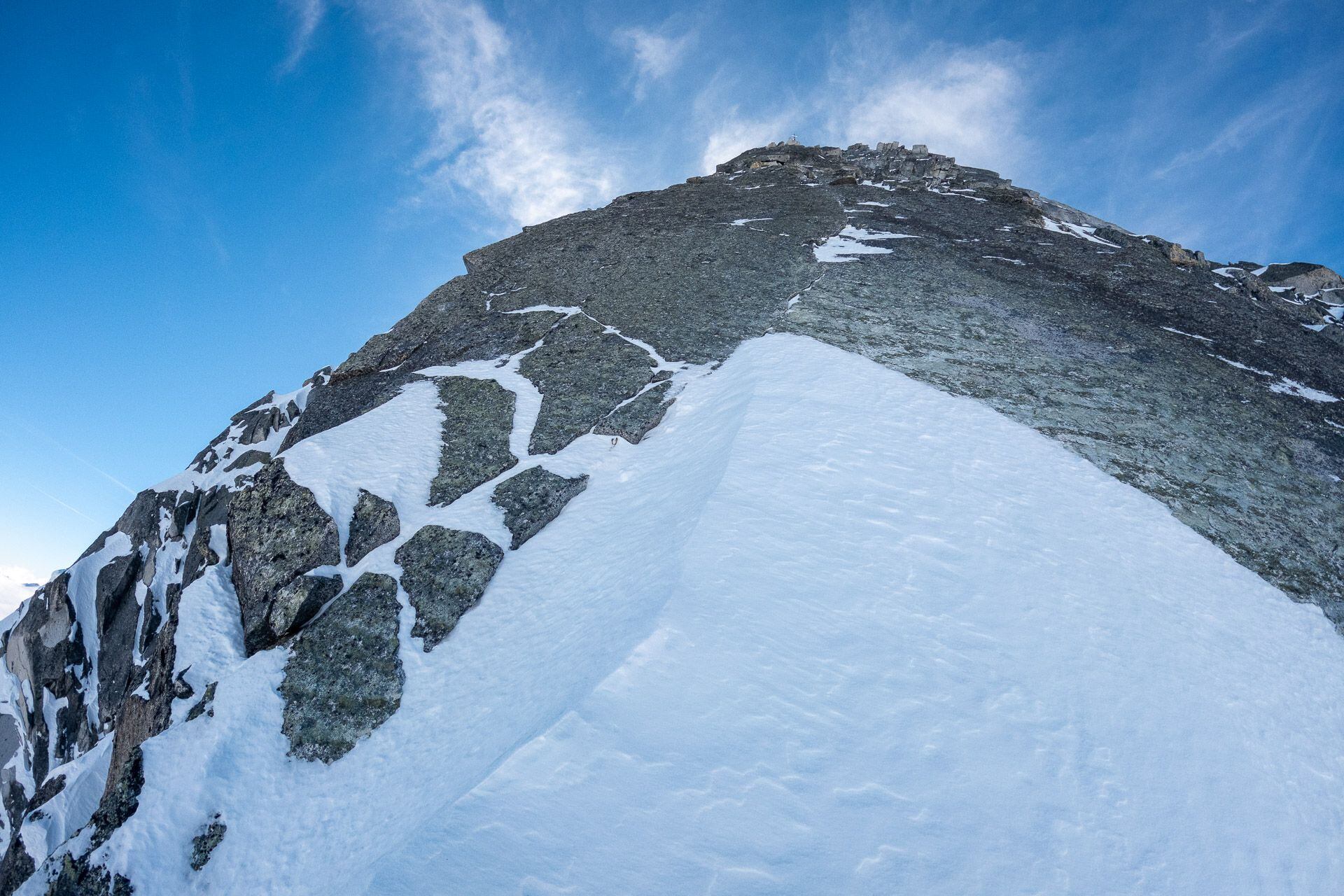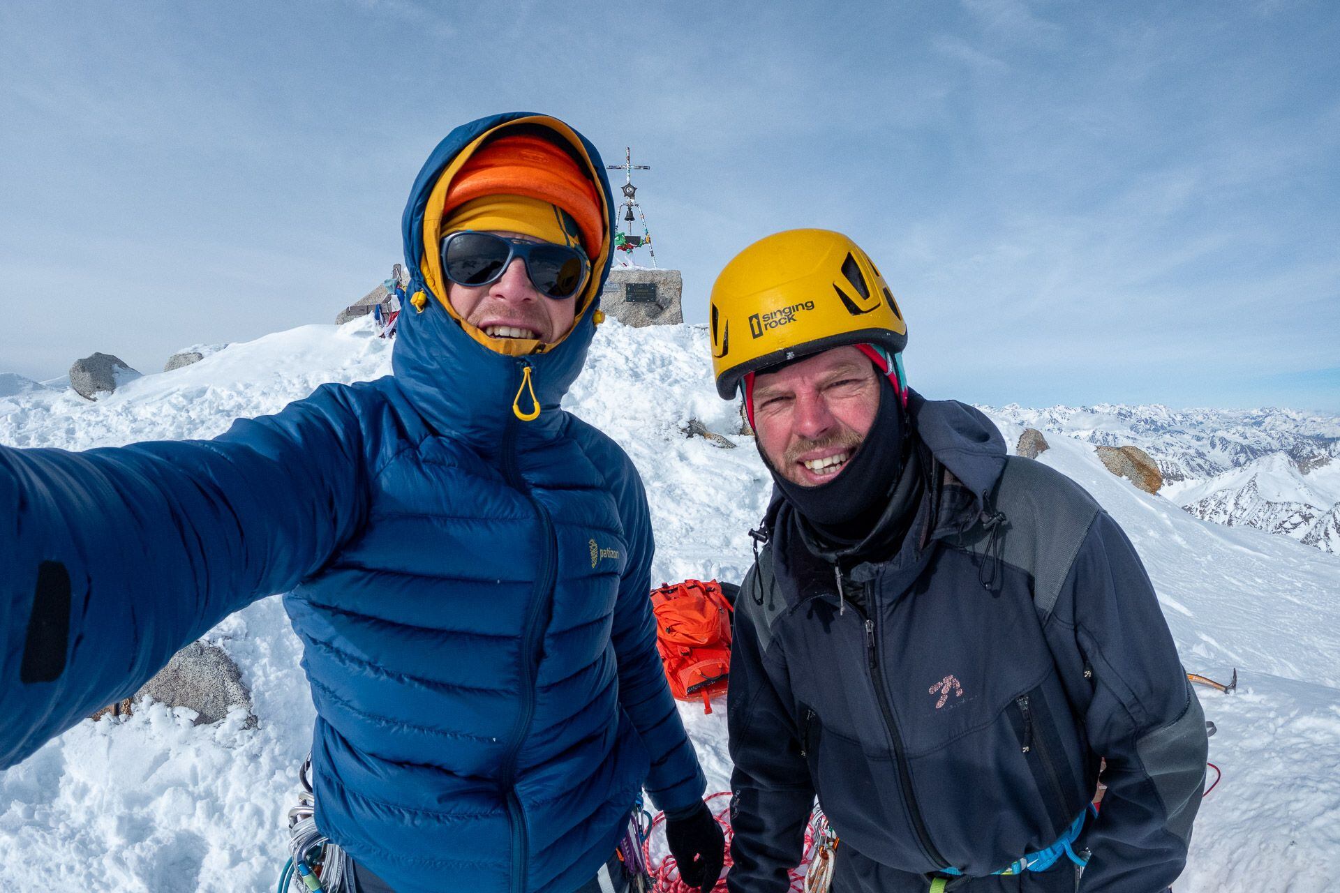 Na vrcholu nás kromě slunce vítá i pětičlenná skupina skialpinistů. Sice nám věnují slova chvály, ale my bychom si to s nimi v tu chvíli rádi vyměnili. Na lyžích bychom byli dole coby dup. Takhle nás čeká dlouhé plahočení.