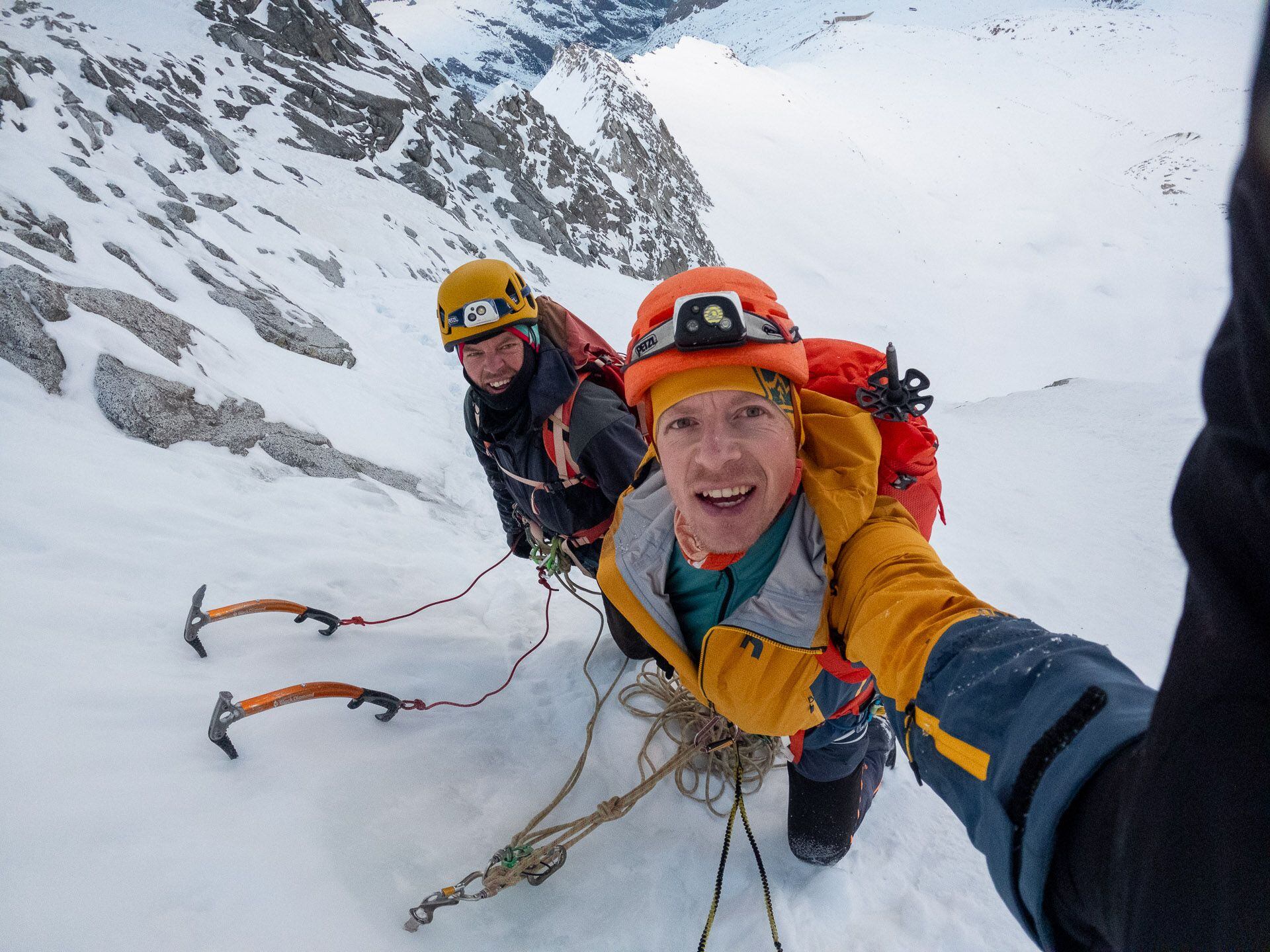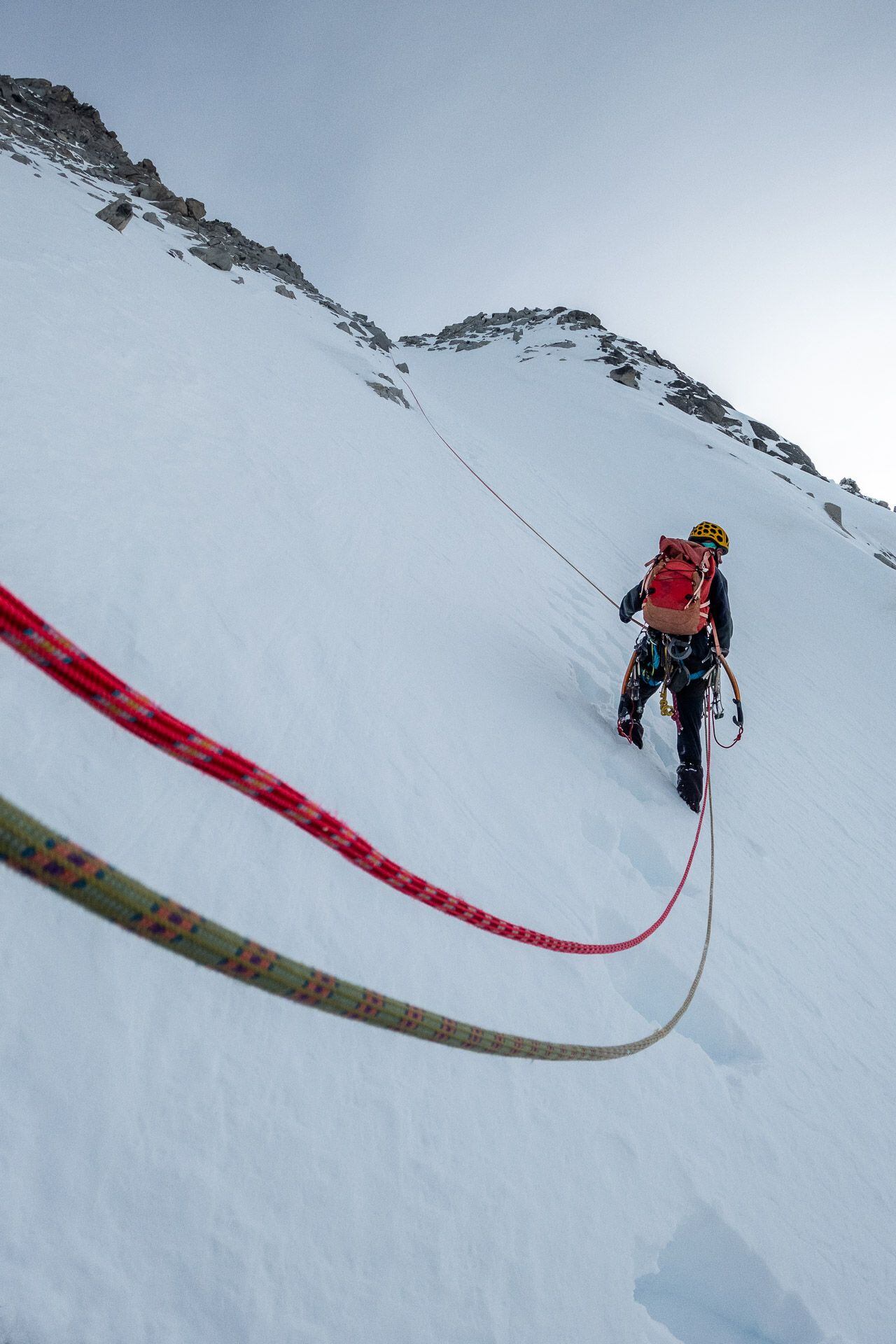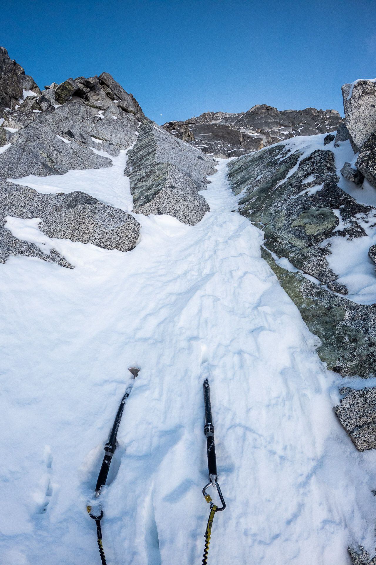 Budík zvoní ve 4:00 hod., ale nemusí se ani moc snažit. Odpočatí jsme dost a těšíme se, ať už nás ve stěně čeká cokoliv. Ve vyšlapané stopě se nám jde dobře, ale je nám jasné, že si tu kluci předchozího dne odbyly slušnou šichtu. Místy je prašanu po kolena. Strmým svahem se blížíme k odtrhovce, strojíme se a navazujeme se. Pořád ještě ve stopách našich předchůdců lezeme 50–60° svahem.