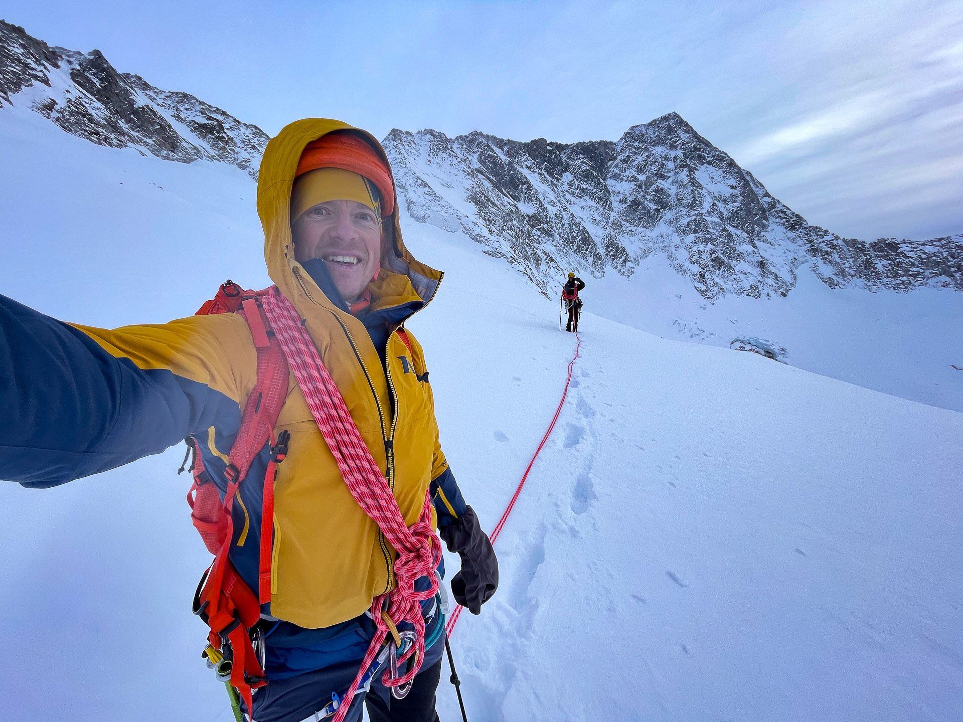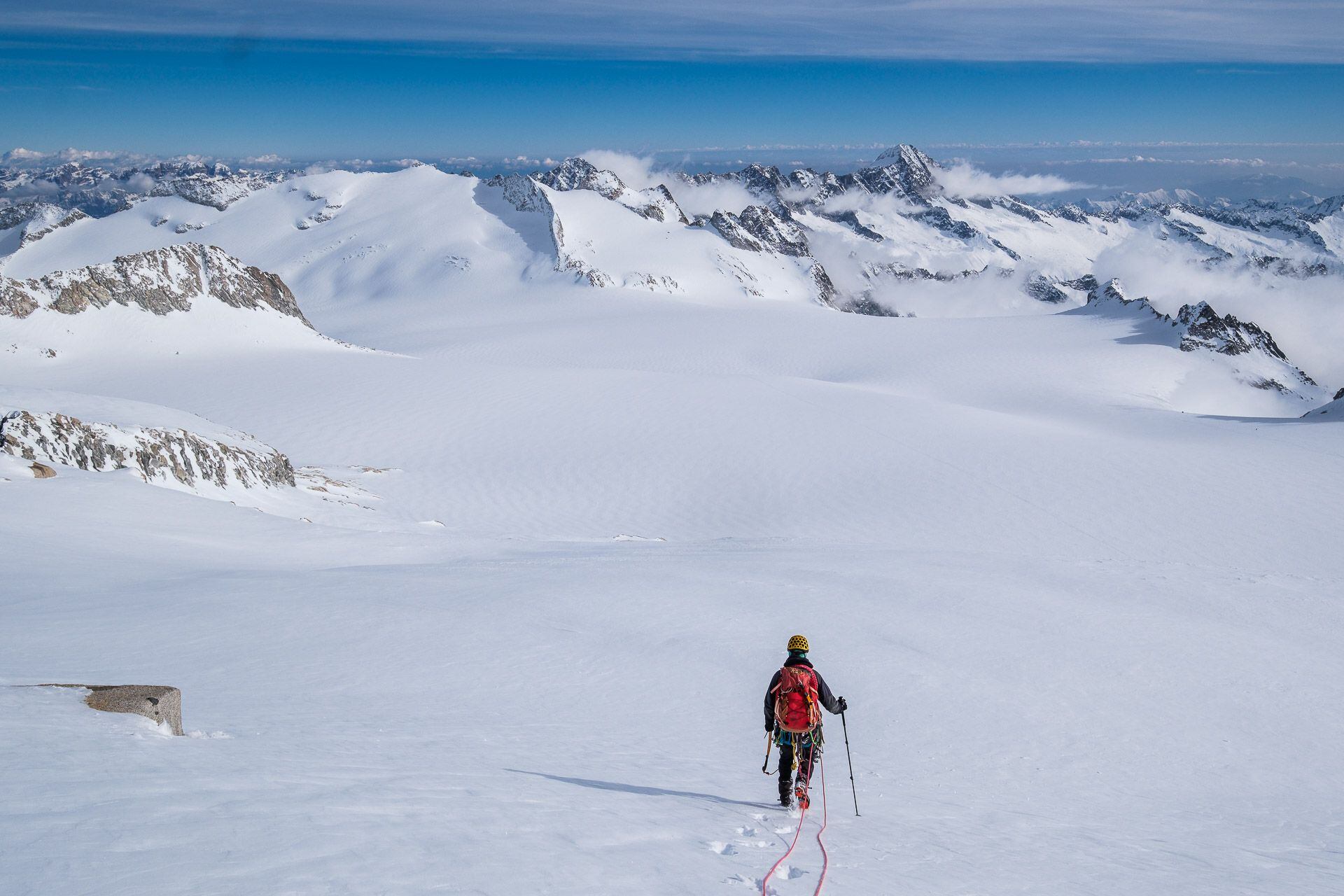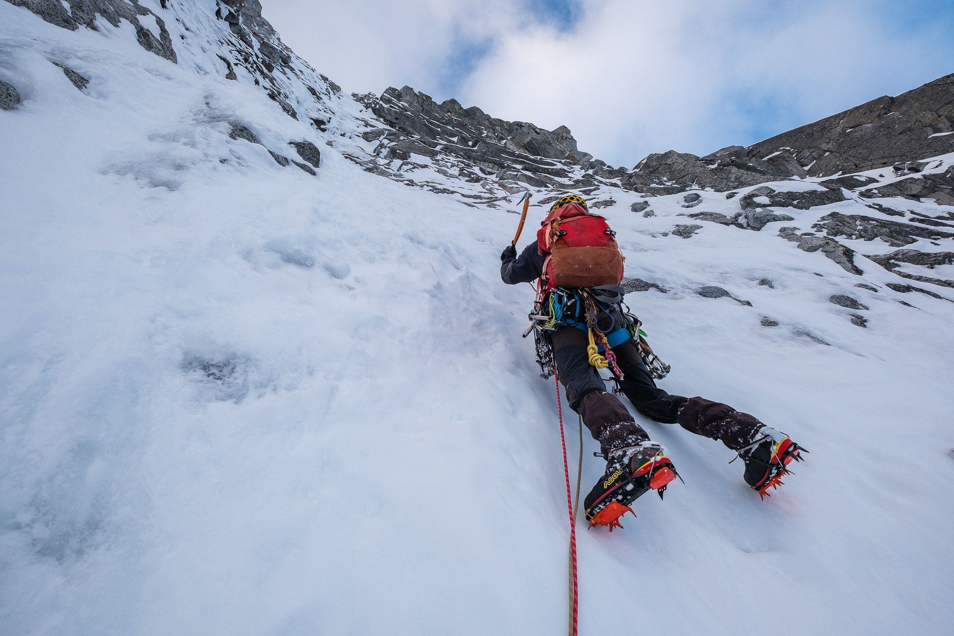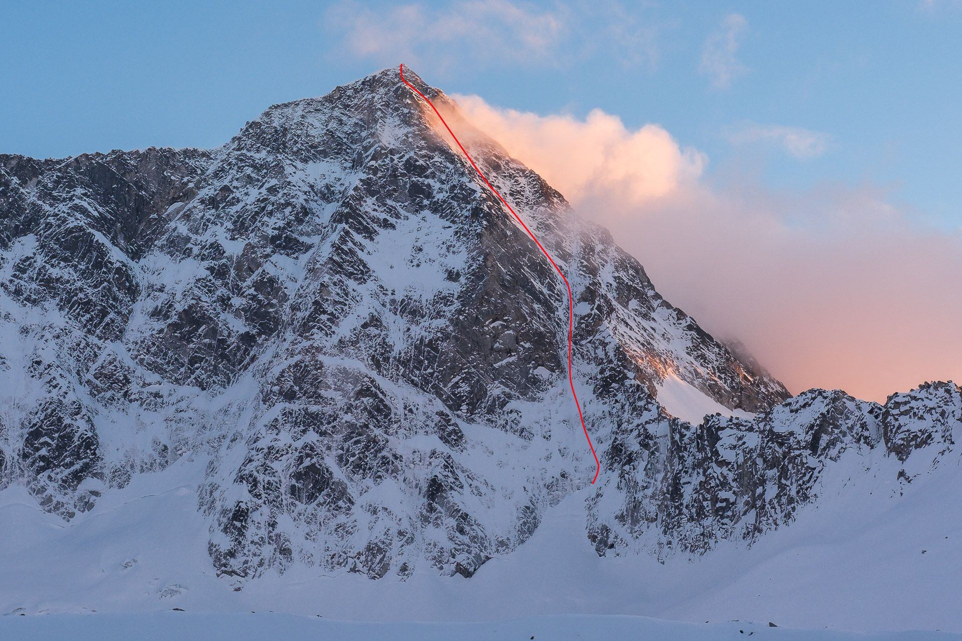 Budík zvoní ve 4:00 hod., ale nemusí se ani moc snažit. Odpočatí jsme dost a těšíme se, ať už nás ve stěně čeká cokoliv. Ve vyšlapané stopě se nám jde dobře, ale je nám jasné, že si tu kluci předchozího dne odbyly slušnou šichtu. Místy je prašanu po kolena. Strmým svahem se blížíme k odtrhovce, strojíme se a navazujeme se. Pořád ještě ve stopách našich předchůdců lezeme 50–60° svahem.
