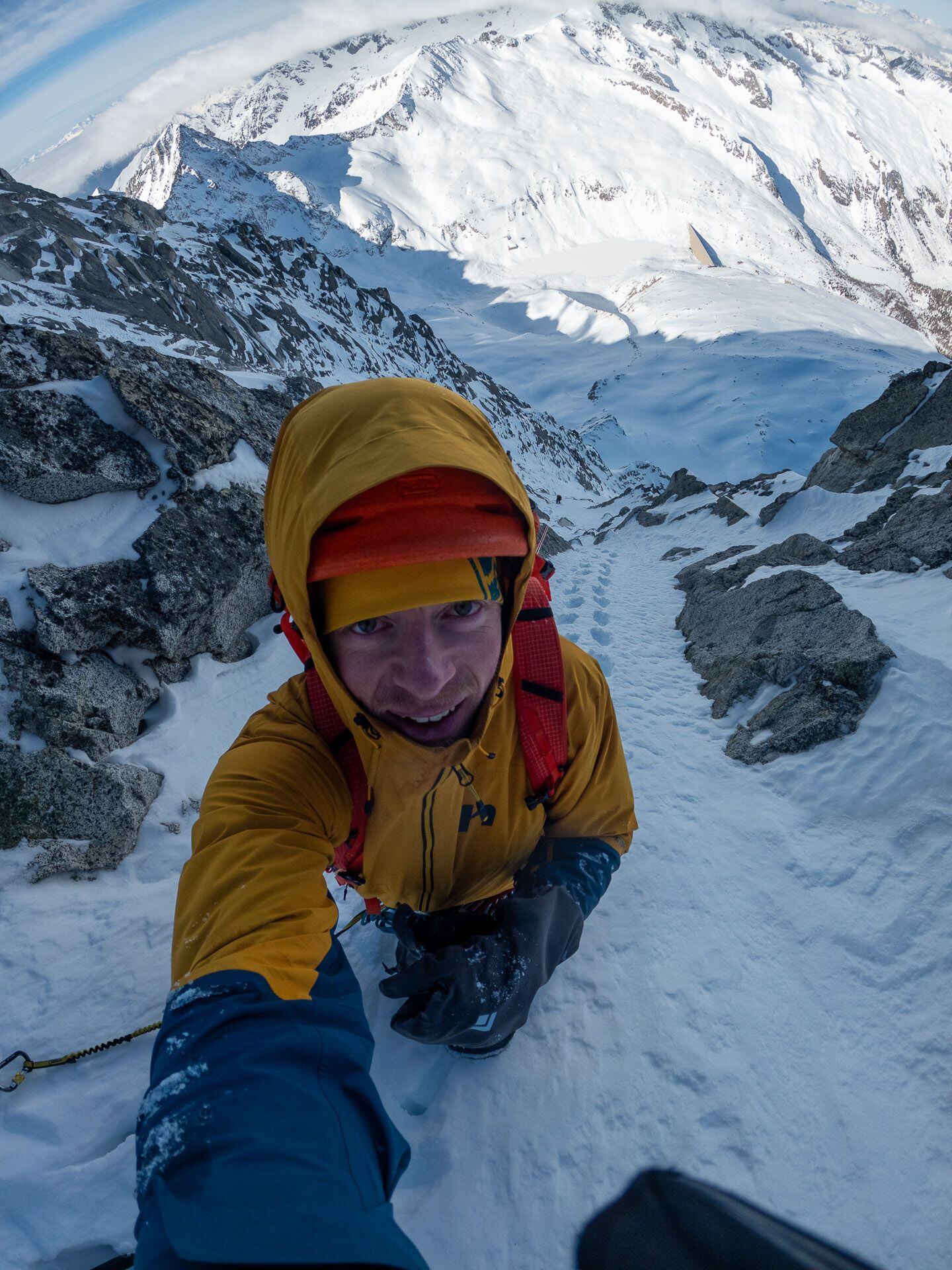 V prostřední části stěny se trochu srovnáme. Beru na sebe všechen matroš, který máme s sebou a lezeme na průběh. V následujících asi 300 metrech se střídá trocha ledu, sníh, firn a v závěru pěkné mixové pasáže. Tady je to zábava a odsejpá nám to, vylezeme to na jeden zátah. Dokonce i kříž osvícený blahodárným sluncem už je na dohled a dalo by se říct, že i na dosah. Jenže mezi oním spásným místem a námi je klíčové místo výstupu.