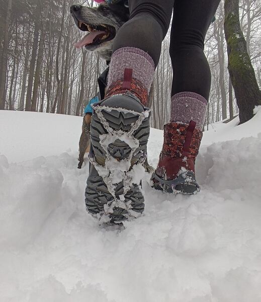 Při pohybu vyšším sněhem je výhodou vysoko vyvedený komín. Trochu mi chybělo kovové očko v přední části boty, když jsem chtěla použít návleky proti sněhu. Návlek sice lze uchytit háčkem za poslední řadu tkaniček, ale častějším používání hrozí jejich mechanické poškození.