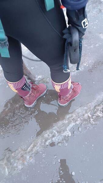 Pokud jde o pohyb v horách tady bych doporučila zvolit naopakponožky o něco tenčí. Boty samy o sobě jsou opravdu teplé, tenčí ponožkou předejdete zbytečnému pocení nohy a nebude vám v botách až příliš horko.