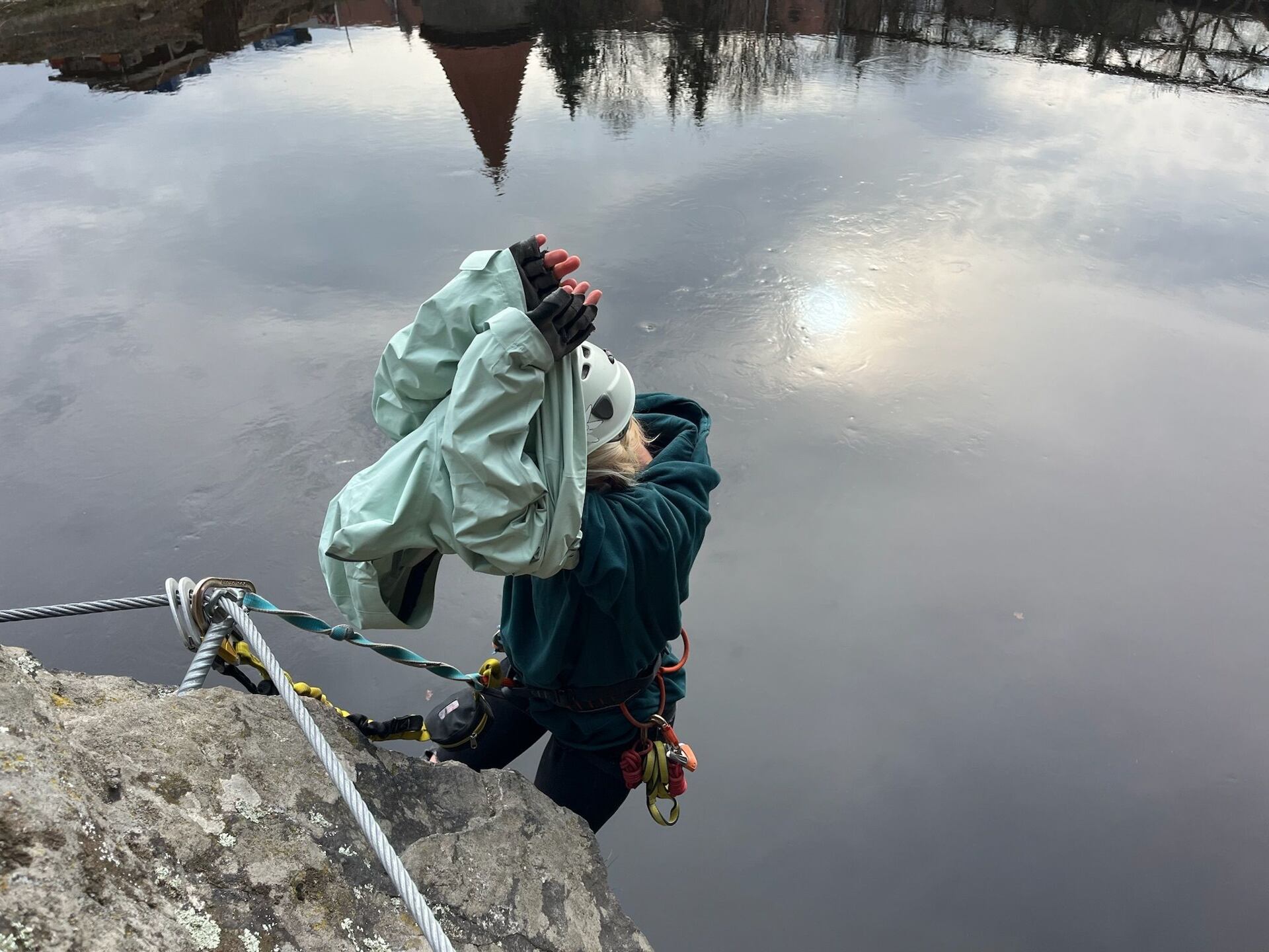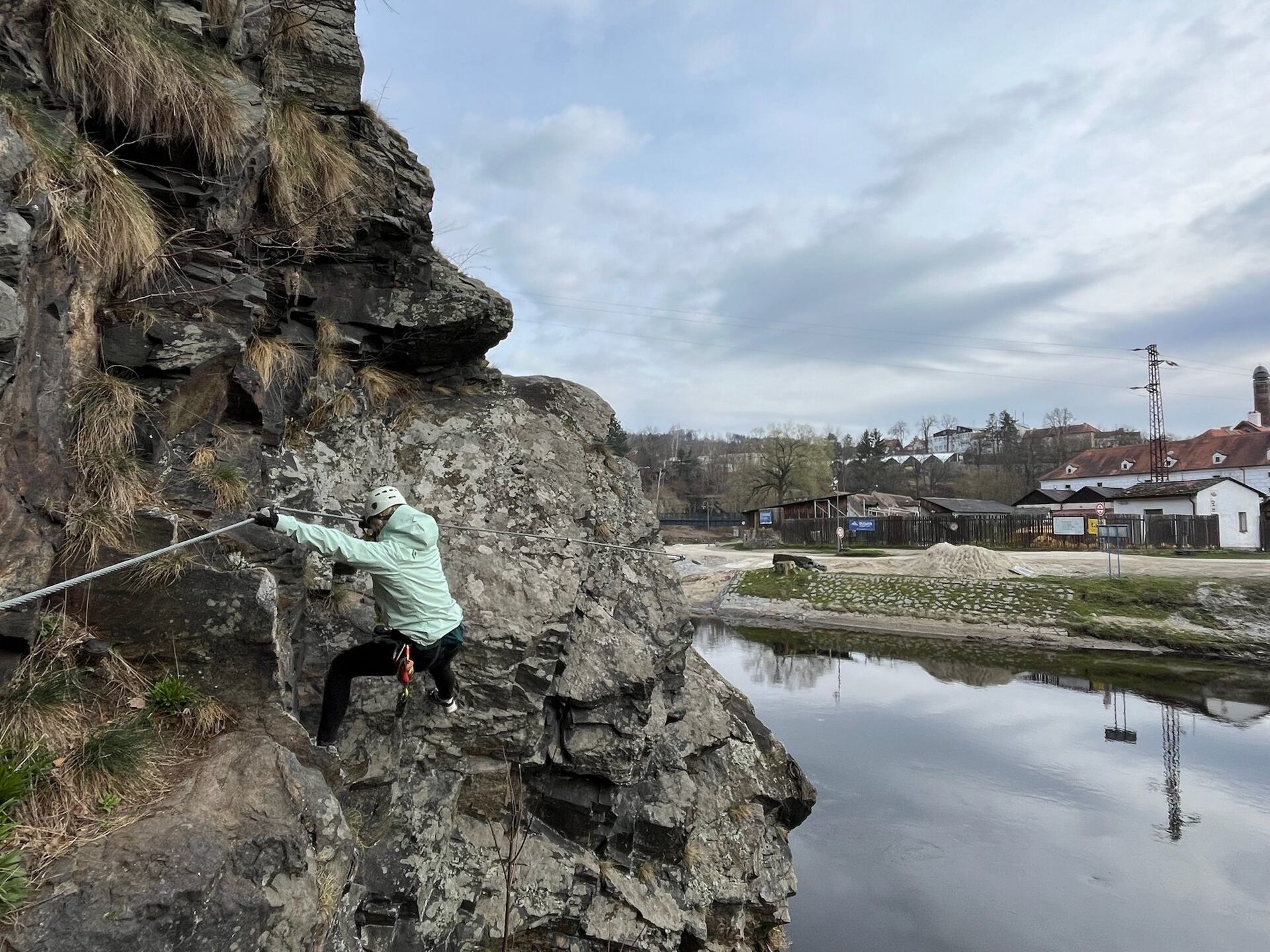 Stormline Stretch Anorak je na ferratě super. Pokud se budete potřebovat na ferratě přiobléknout, lehce a hravě bundu oblečete i s nasazenou helmou. Díky nastavitelné kapuce si jí hravě stáhnete a díky tomu budete perfektně chráněni před větrem i deštěm. Vysoký límec při stáhnutí kapuce perfektně zaizoluje. Pohyb v bundě na ferratě zvládám s lehkostí, přijde mi, že bunda se pěkně přizpůsobuje pohybu.