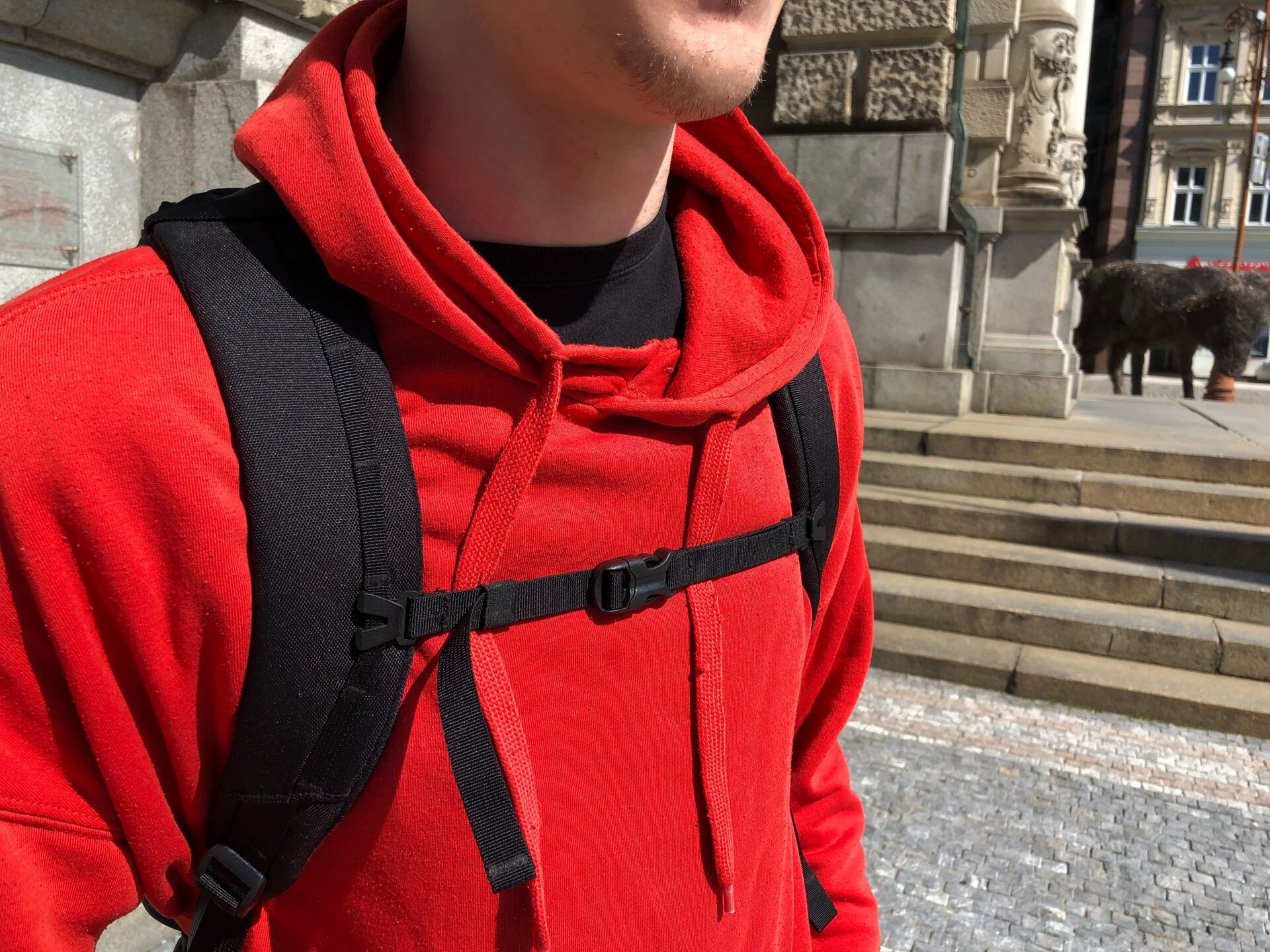 Díky polstrovaným popruhům a zadní části je velmi pohodlný i pří vícehodinovém nošením. Na zádech je průchozí popruh, který lze prostrčit na rukojeť příručního kufru a batoh tak na něj naložit, což jsem zatím nevyužil, ale v plánu mám. Vpředu je pak výškově nastavitelný prsní popruh. Při jízdě na motorce mi ale chyběl bederní pás pro pevnější uchycení na těle. Osobně se mi nejvíce líbí pás uprostřed batohu na možné přichycení karabin.