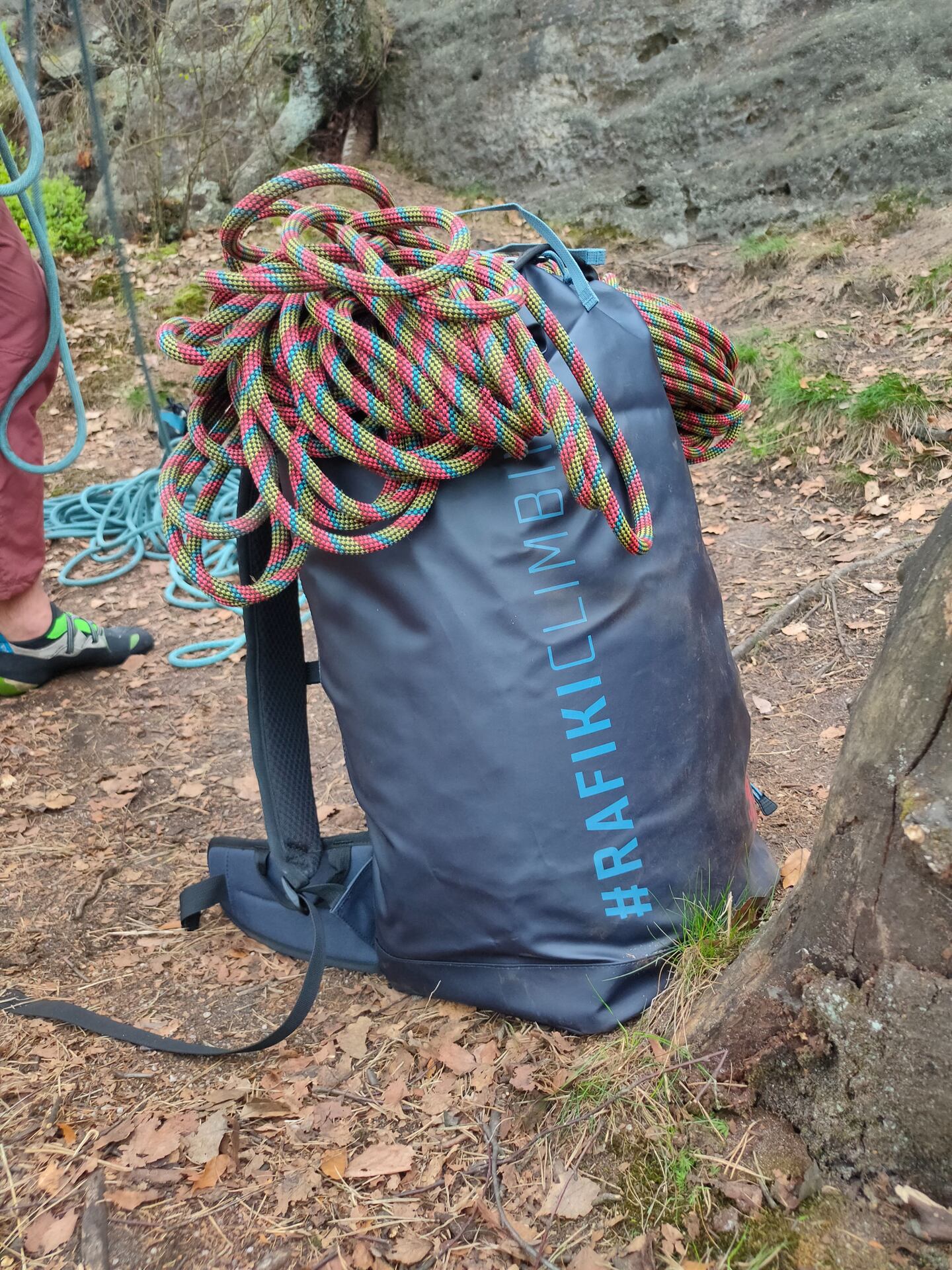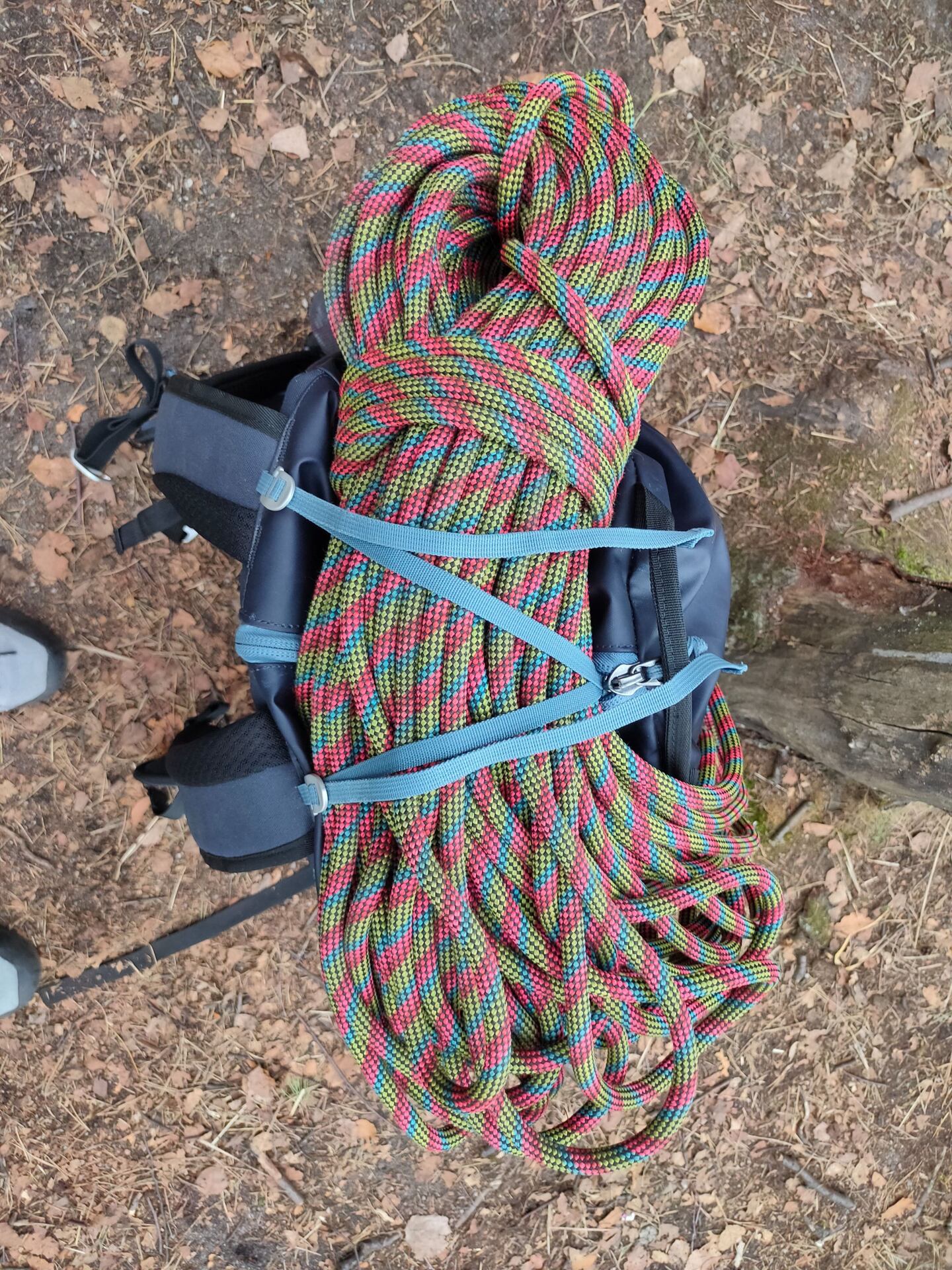 Pokud lano nezvládnete našťouchat přímo do batohu (já tam šedesátku i s ostatními věcmi nacpat zvládla), dá se pomocí dvou popruhů připevnit navrch.