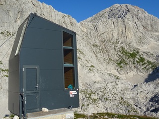 Západní svah Skuty byl úplně jiná liga, naprostá pohoda oproti tomu východnímu. K modernímu designovému Bivaku Pavla Kemperla už to byl jen kousíček, a byla to tam skvělá noc, úplně příkladně bivaková a komunitní – nějakým zázrakem jsme se tam sešli s Němcem, Italem, Rumunkou, Američankou a třemi Slovinkami.