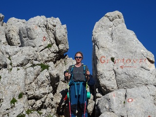 Devátý den pochodu nás čekal Grintovec (2 558 m. n. m.), nejvyšší hora Slovinska ležící mimo Julské Alpy. Vede na něj jedna cesta z jihu od Zoisovy koči, která je podle mapy nenáročná, a pak zajištěná ze severu. My jsme šli ze severu, protože se nám to víc hodilo do itineráře. Parádní výstup, užili jsme si ho, navíc jsme tam byli už o půl deváté ráno, takže skoro sami, a mohli jsme se kochat výhledy a krmit ptáky tyčinkami.