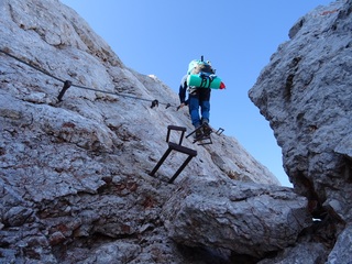 Výstup z Robanova kotu na Planinu na Korošici, který zespoda vypadal jako špatný vtip, nám dal celkem jasně najevo, že teď pár dnů hůlky nebudeme potřebovat. I když každé dílčí lano či úsek s železnými stupy se dal dobře zvládnout, délkou to bylo docela náročné. Sice jsme nemuseli řešit vyhýbání, protože jsme po celý výstup vůbec nikoho nepotkali, na druhé straně ta liduprázdnost tomu jaksi přidává na adrenalinu a vážnosti. Kam to proboha lezeme, že tam nikdo jiný nejde?!
