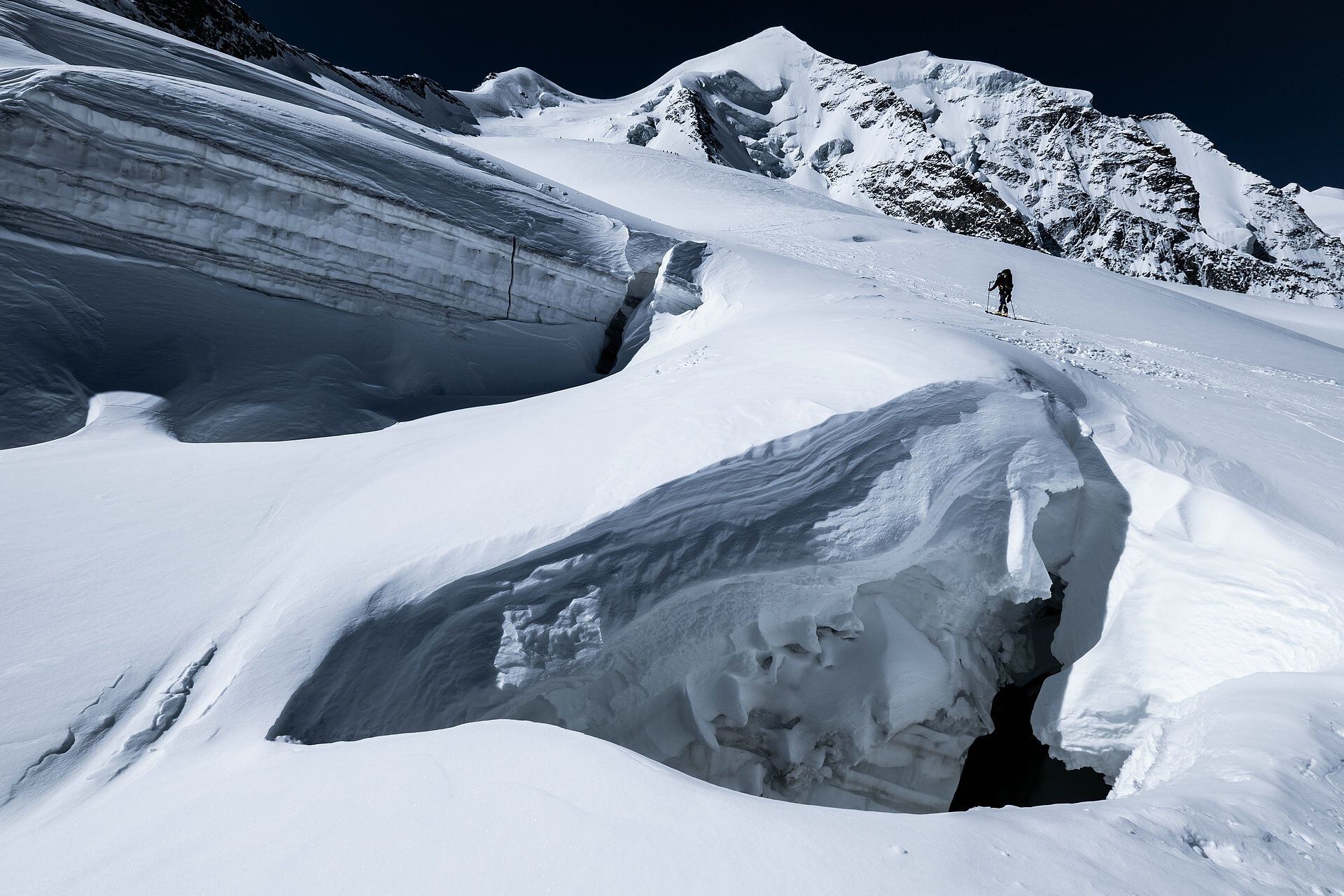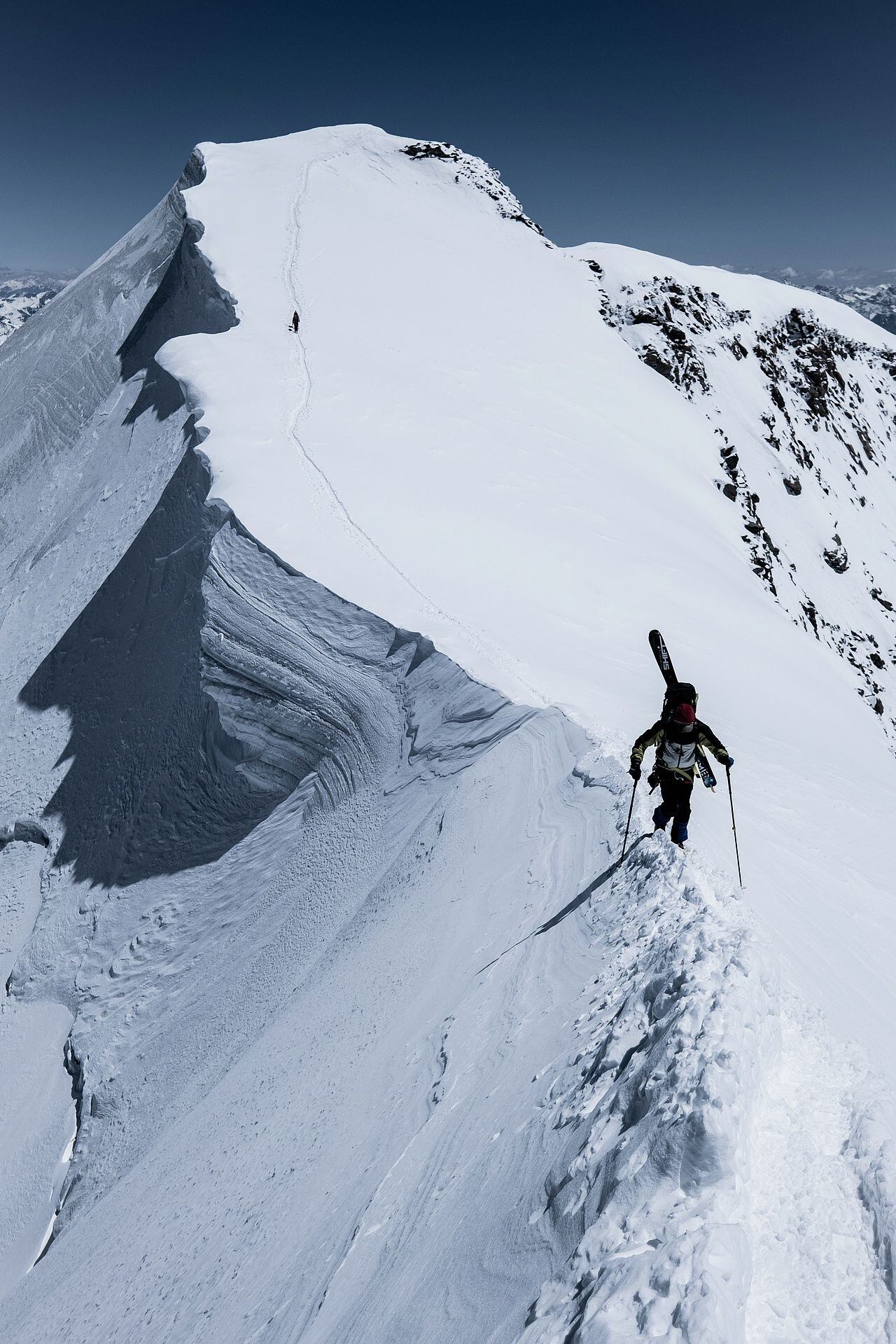 Po dosažení hřebene pokračuje trasa ještě strměji k východnímu vrcholu Piz Palü. Někteří se spokojí s tímto cílem a vrací se zpět, ale je právě tady začíná nádherná hřebenovka přes centrální a západní vrchol, která už jen mírně mění svou výšku a přichystá velkolepý zážitek.