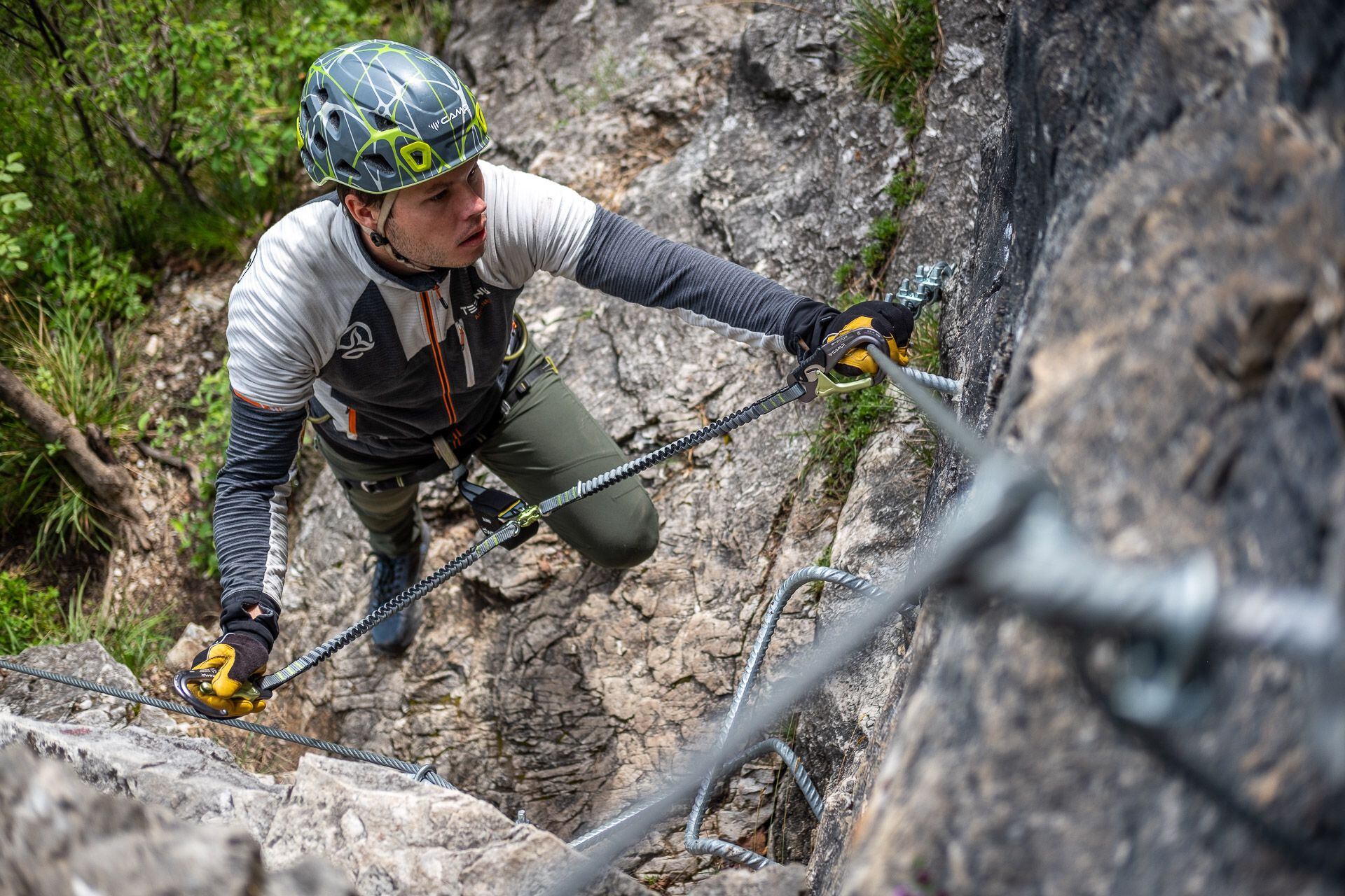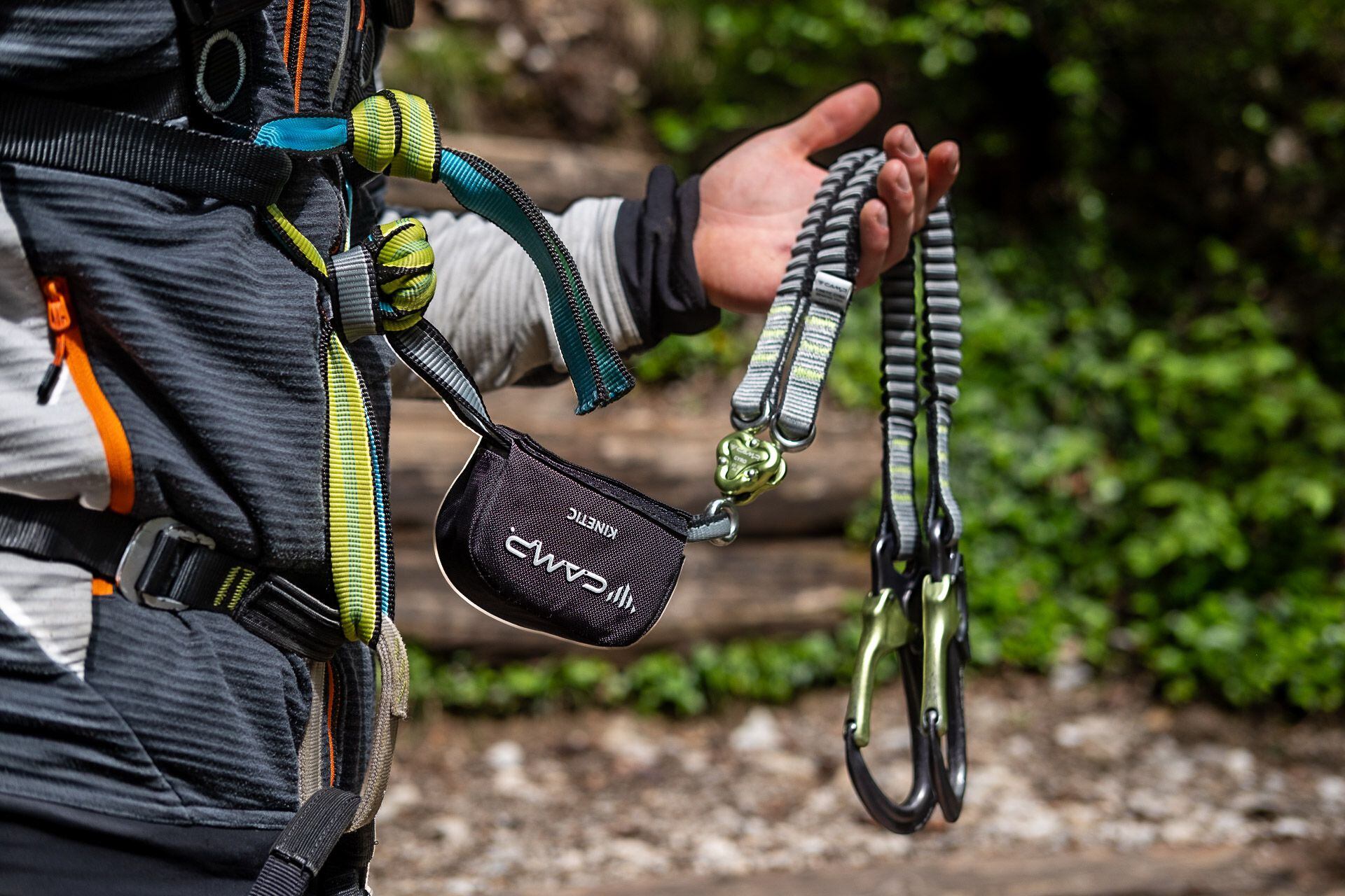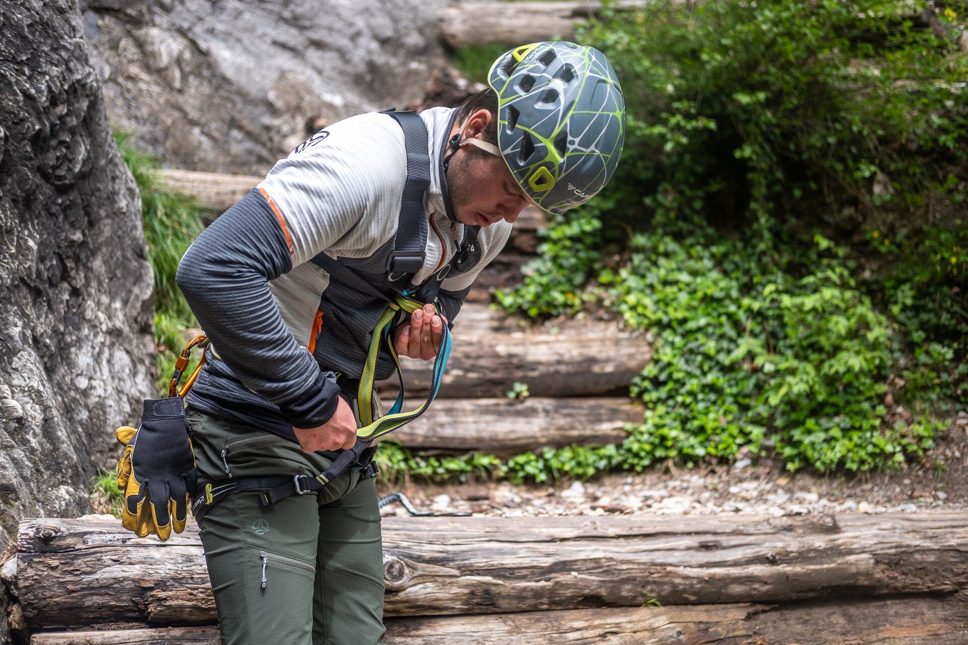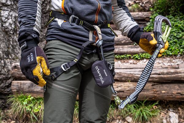 Málokdo totiž ví, že si můžete odsednout rovnou do ferratového jistícího setu a rychle a jednoduše si tak na ferratě odpočinout. Při statickém zatížení se totiž tlumič neaktivuje. Ale při sednutí přímo do ferraťáku se elastické popruhy od karabin natáhnou, nedosáhnete na jistící lano a horko těžko se vám pak k němu vrací zpět.
