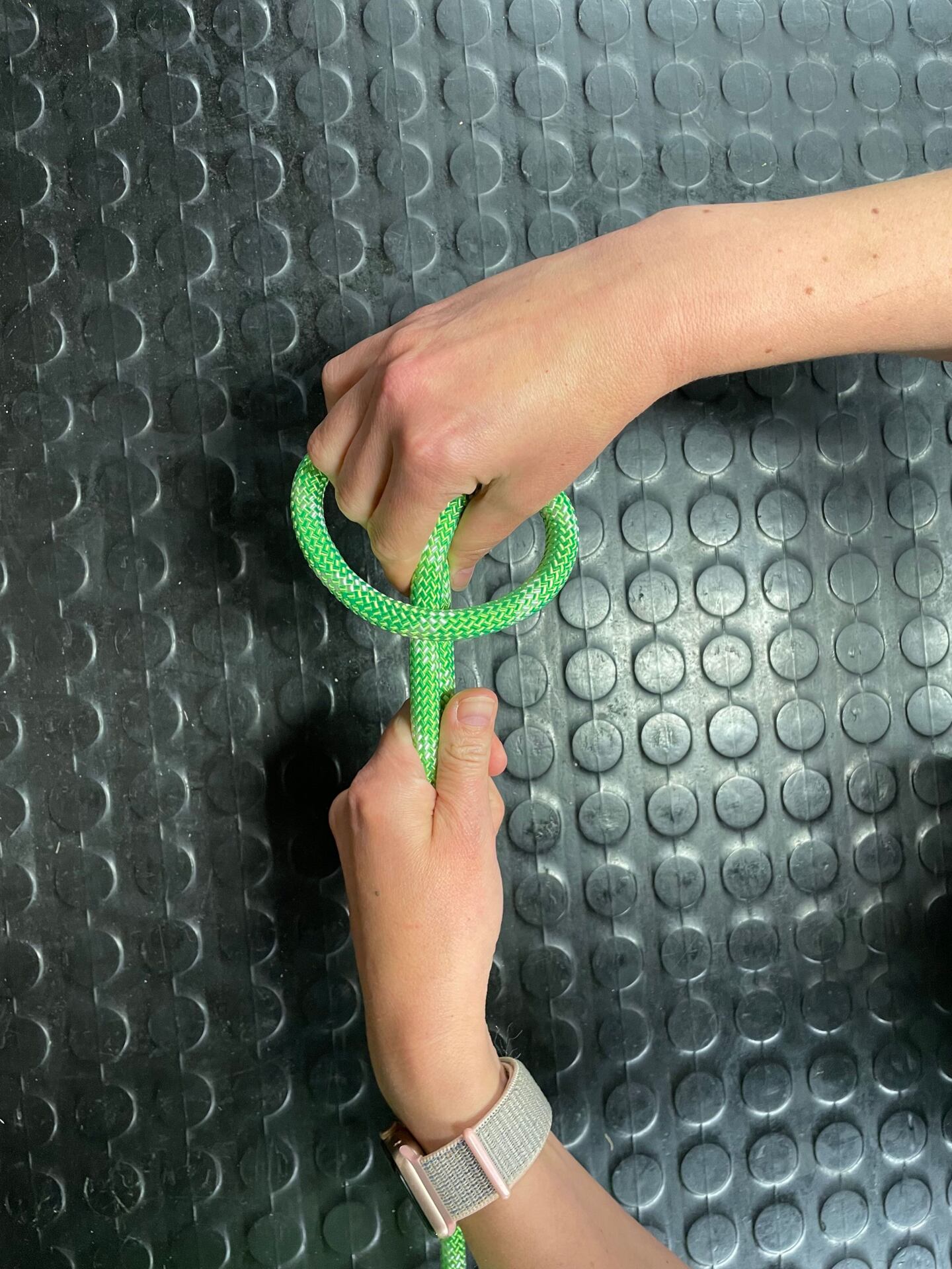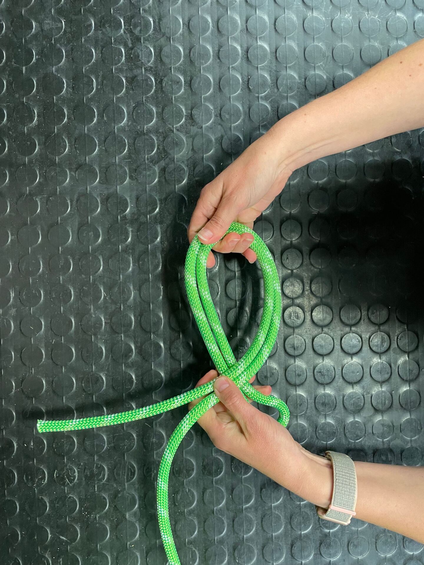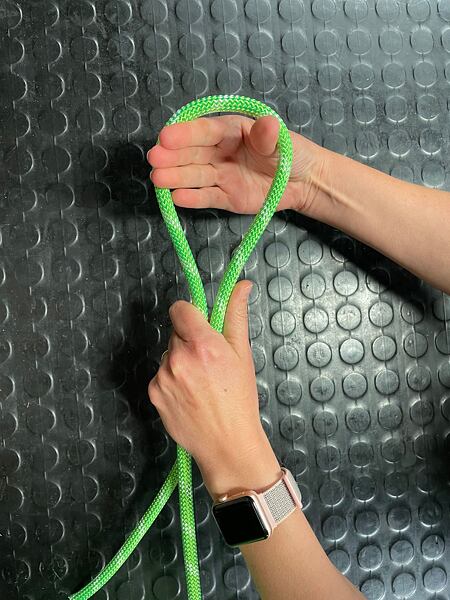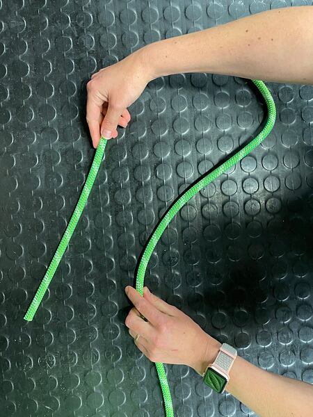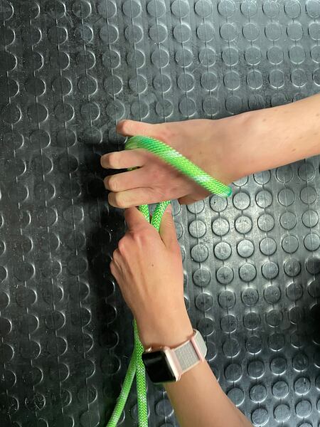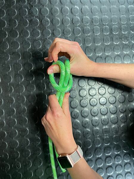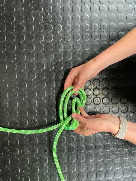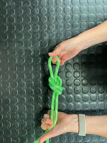 Před dotažením druhého uzle je dobré se mírně předklonit pro správný dotah celého provázání