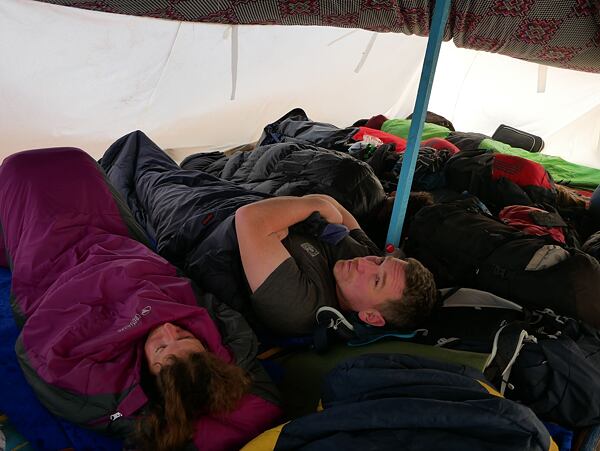 Večer jsme strávili ve stanech mezi pískovými dunami za vesnicí Imzi. Hvězdy na nás pomrkávaly celou noc a písek nás jemně hladil a hřál do zad. Ráno jsme před stanem objevili věrnou fenu Django, která nás provázela procházkou po okolí celé ráno. Když se zvedl vítr, sbalili jsme stany a vyrazili na snídani do Tamri. Zde dávali do omelety místní zelená rajčata a dva trojúhelníčky taveného sýra.