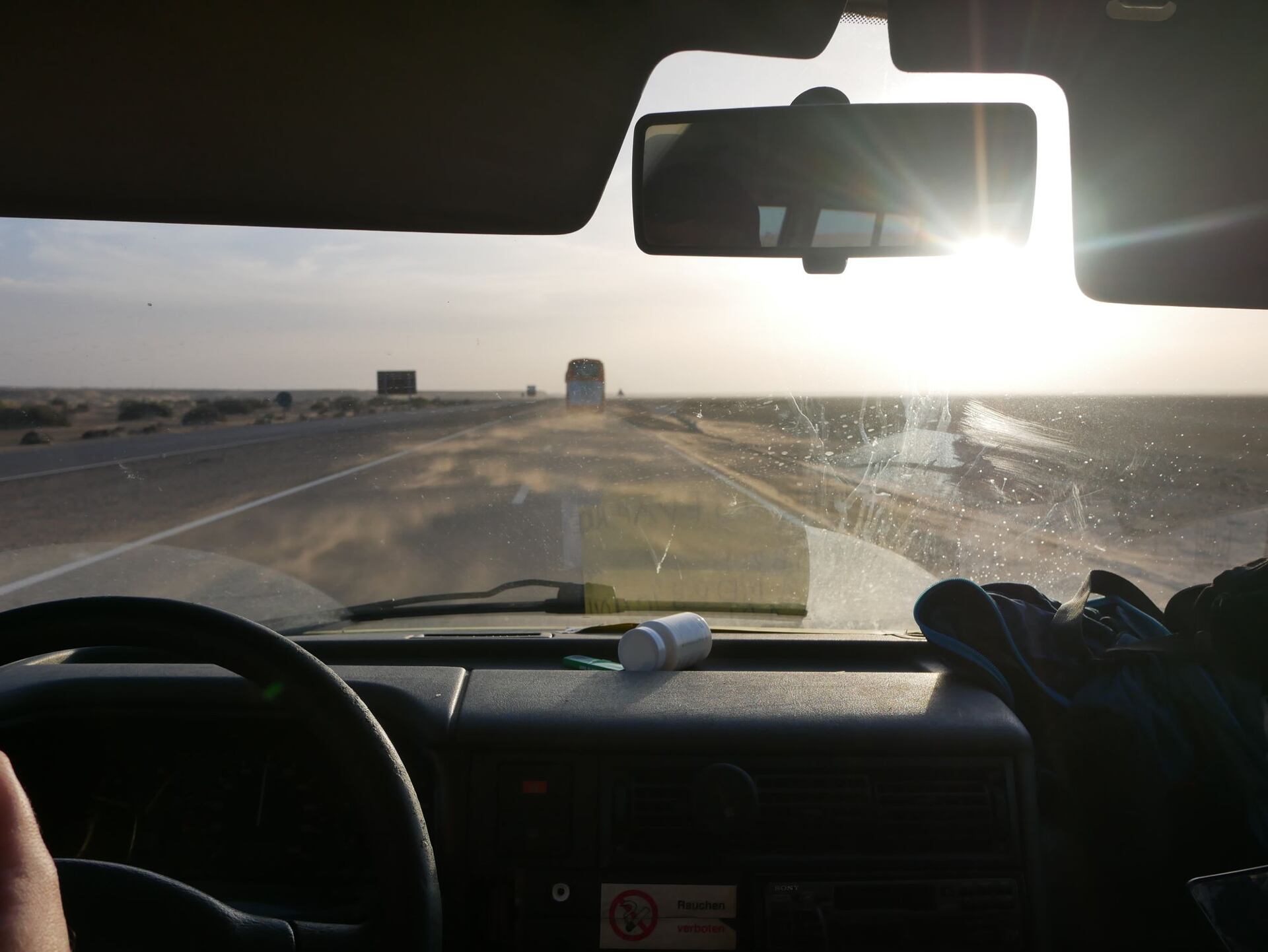 I přes to, že je devět hodin v noci, nasedáme zpátky do auta a vydáváme se dále. V mapách zkoumáme množnosti toho, kde jinde bychom se mohli uložit ke spánku, ale všude kolem nás je jen písek. Šlapeme tedy na plyn a dorážíme až do prvního města Západní Sahary, Laayoune.