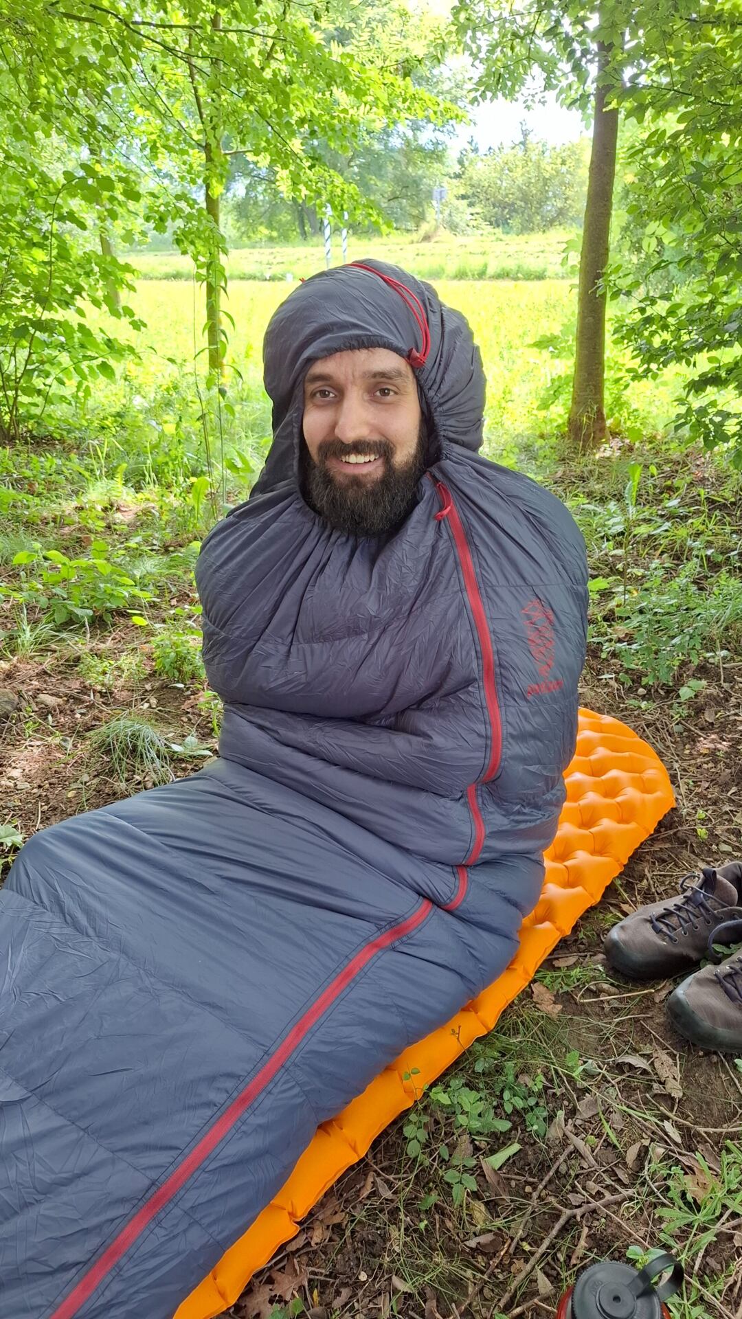 Po rozbalení se díky poměru prachového peří 90/10 zase krásně nafoukne a spí se v něm jako v peřince. Tvar spacího pytle volně kopíruje tvar těla. Díky širšímu střihu se můžete klidně i převalovat ze strany na stranu. Je to snad první spacák, ve kterém jsem pohodlně prospal celou noc, aniž bych se při každém pohybu probudil.