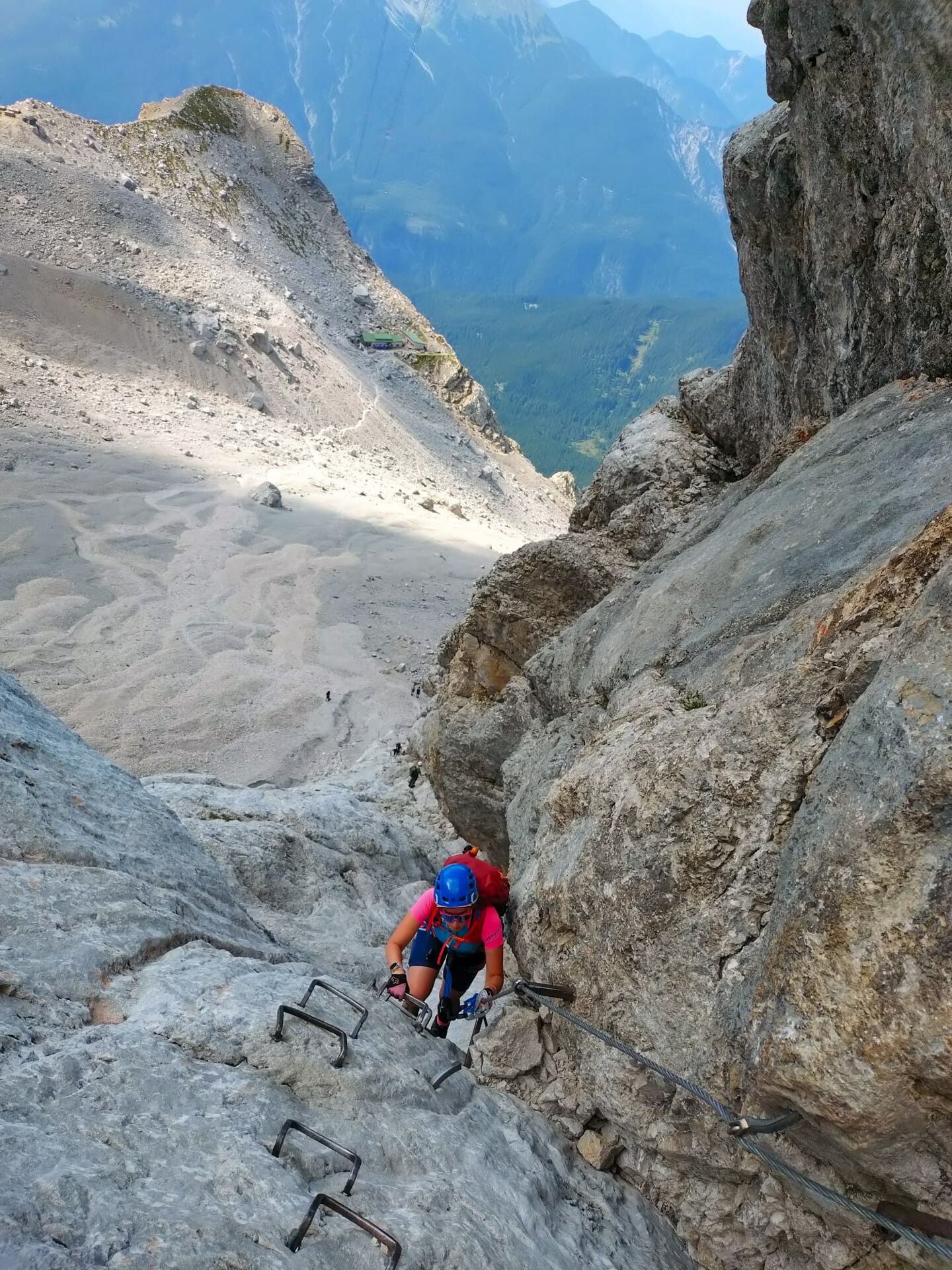 Začali jsme ve vesnici Ehrwald, z vesnice pokračujete lesní cestičkou a sjezdovkou až k poměrně rozsáhlému suťovisku. Zde jsem ocenila zejména výšku bot. Kamínky mi do nich téměř nepadaly. Následně stoupáte prudším a místy ne příliš stabilním horským terénem až k chatě Wiener-Neustädter Hut a odtud pokračujete sutí dál až pod ferratu, která je značená jako A/B. Určitě patří mezi ty jednodušší. Neřadím se do skupiny zdatných a ošlehaných ferraťáků, takže na této ferratě jsem ani já žádný problém neměla. V horní pasáži je pak úsek plný volných kamenů, ale vše se dá s opatrností zvládnout. Kvalitní obuv rozhodně oceníte.