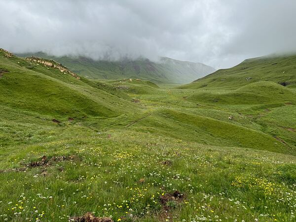 Po dlouhých úvahách se rozhodujeme pokračovat dál zhruba do poloviny původně plánované etapy a podle vývoje počasí se rozhodnout, jestli pokračovat dál nebo to zabalit v nedaleké chatě Linza. Volíme co možná nejdefenzivnější přístup a pomalu klušeme hlubokým údolím.