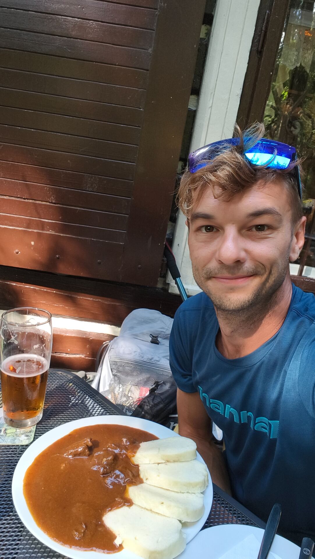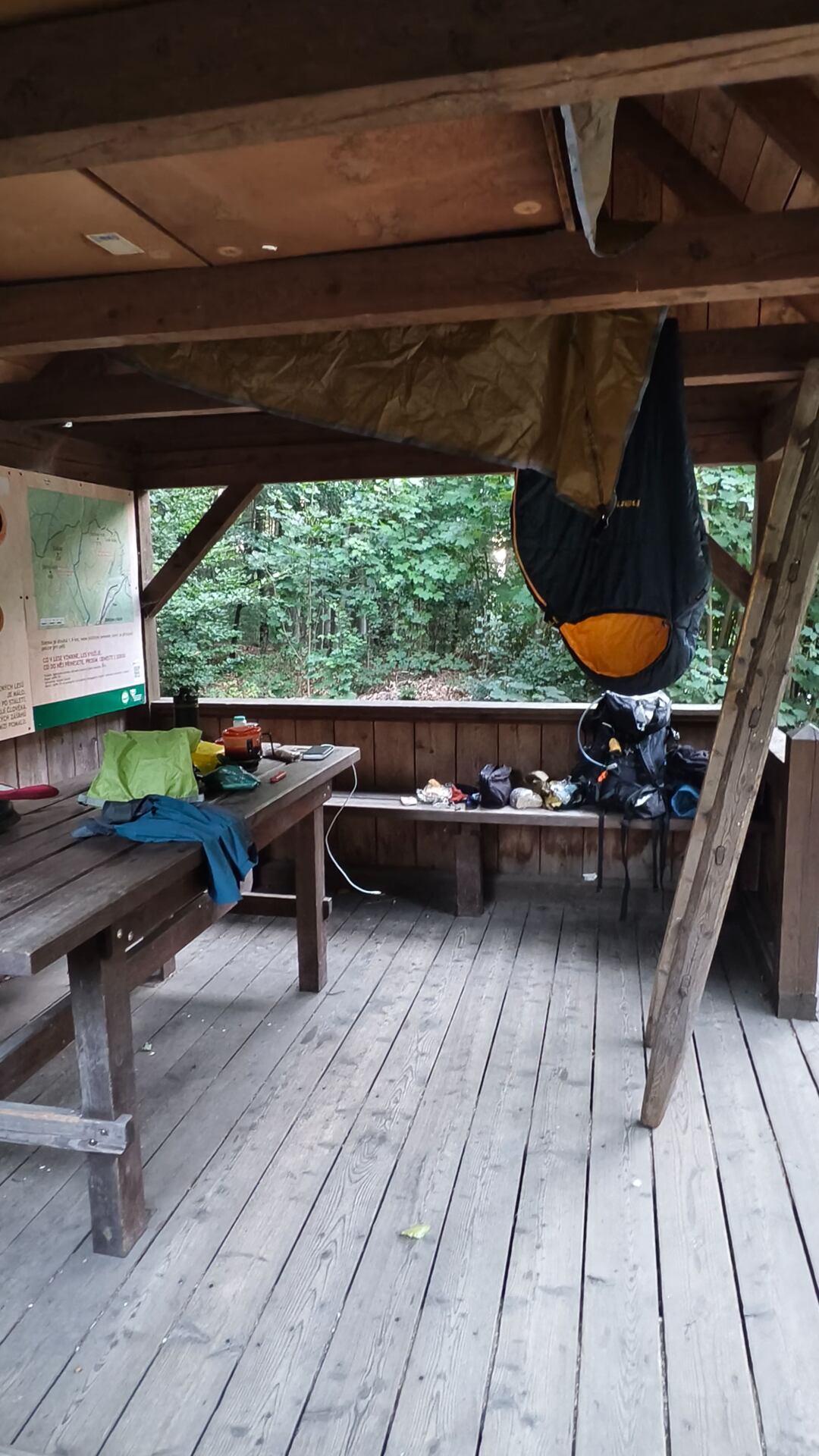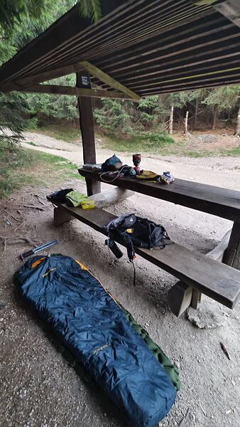 Já měl smůlu (štěstí), že z důvodu soukromé události nebyla možnost posezení ve venkovních prostorách a sedět vevnitř splavený po celém dni se mi nechtělo. Vzal jsem dva plechy a ukuchtil si večeři ve vedlejším přístřešku, kde jsem strávil první noc.