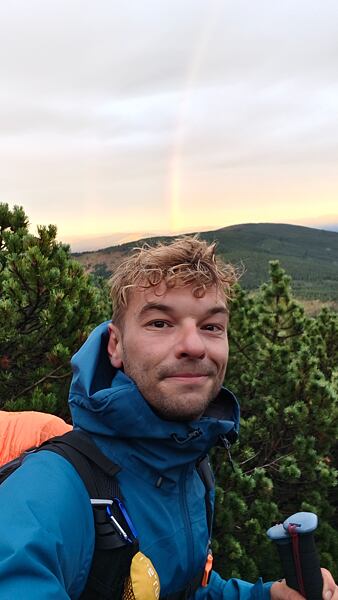 Na vrchol Sněžky jsem dorazil hodinu před západem slunce a díky nepříznivému počasí jsem tam byl úplně sám - skoro zázrak. Při sestupu se obloha rozjasnila a přede mnou se rozprostřel nádherný západ slunce doprovázený duhou. Přespal jsem v útulně naučné stezky Jelení.