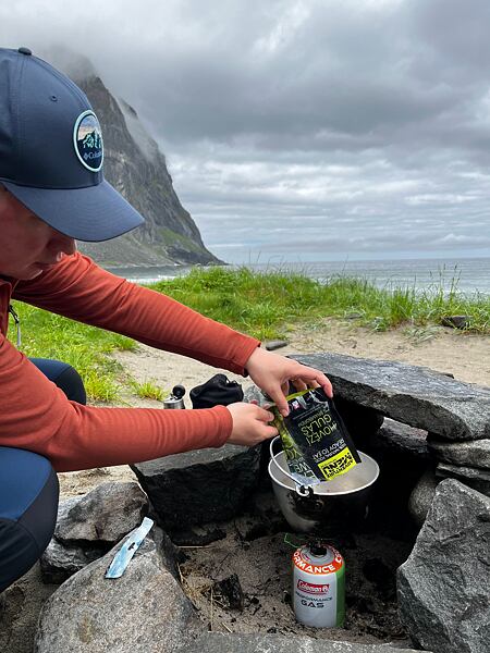 Za slavným výhledem z kopce Ryten jsme vyrazili brzy ráno, díky čemuž jsme byli první, kdo otiskl své stopy do bílého písku na Kvalvika beach (většina turistů vyráží na treky zhruba po 10. hodině). Mohlo by se zdát, že úzké dřevěné lávky dělají tento hike velmi přístupný, ale přesto mohou být některé úseky docela zrádné – pro nás to byl zejména sestup na pláž po rozvodněném a bahnitém kamenném srázu. Nicméně jsme se nevzdali a za odměnu se posilnili vynikajícím gulášem od Adventure Menu.