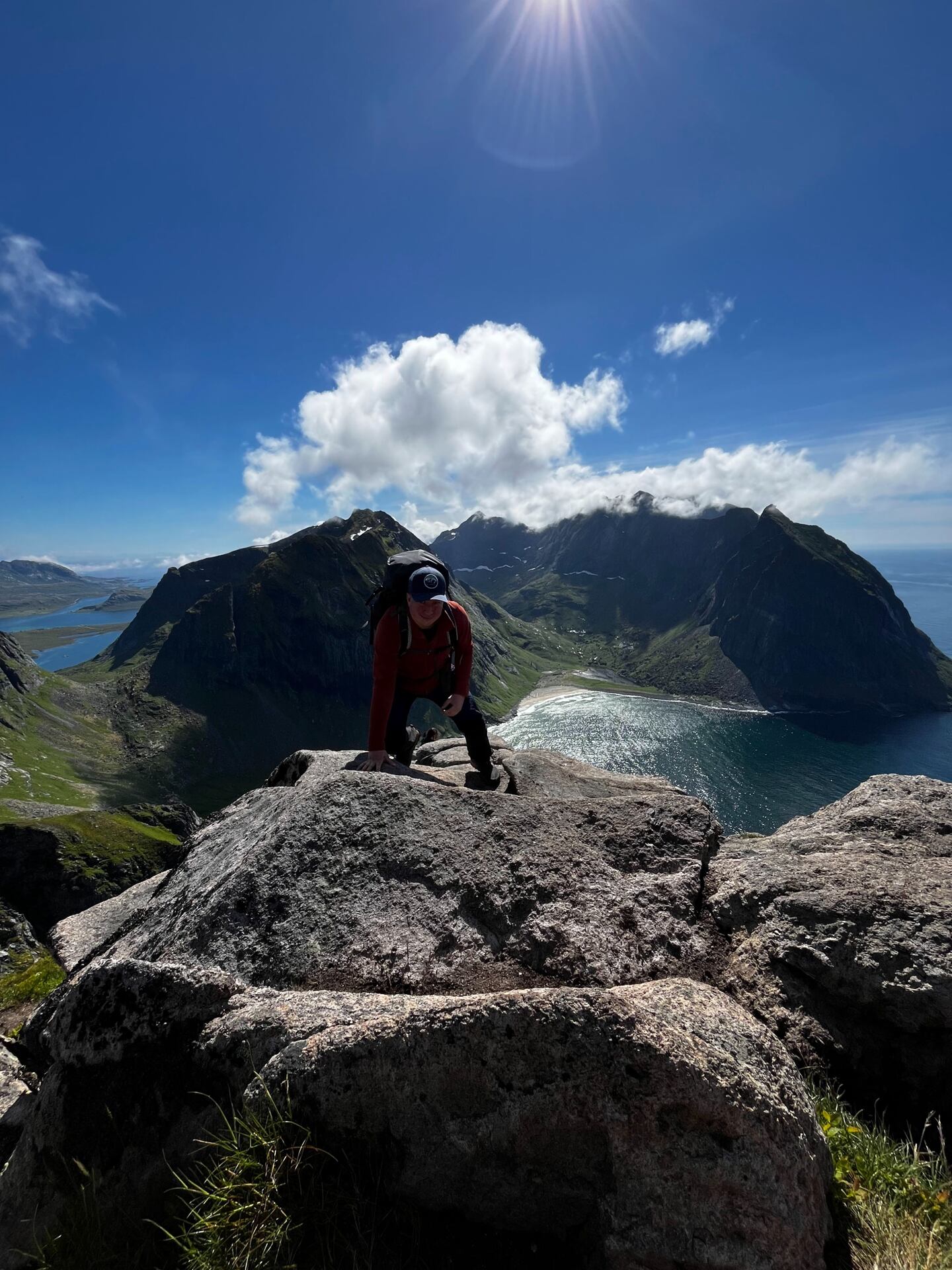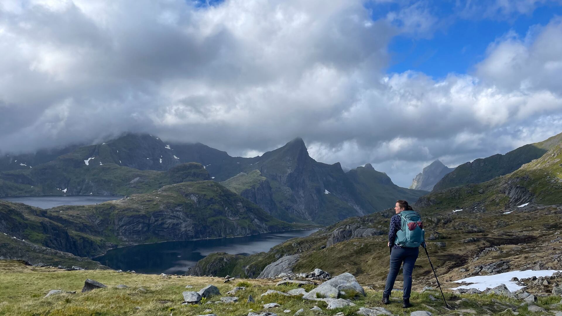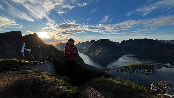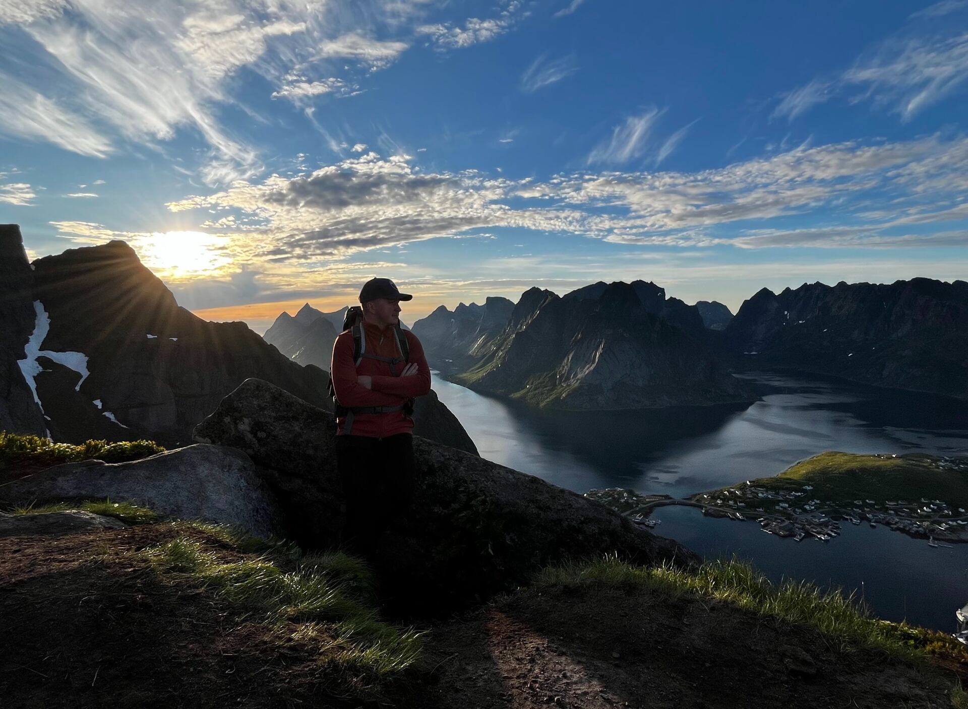 Pro stanování ve výškách a túru téměř bez lidí jsme zvolili výstup na horu Munken. Cesta vede z městečka Sørvågen podél tří jezer a nabízí pohled na nejvyšší horu Lofot – Hermannsdalstinden (1029).