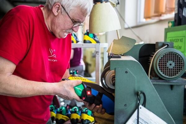 Možná tě to překvapí, ale výroba lezeček je komplet ruční práce. Žádná výrobní linka by nezvládla tak dobře to, pro co mají švadleny v dílně roky trénovaný cit v prstech. Opatřením proti propadu do přílišné rutiny je střídání jednotlivých modelů – každá švadlena v šicí dílně umí ušít všechny. Tím, že si je mezi sebou prohazují, je dosaženo i určité spravedlnosti – není totiž tak náročné ušít roztomilé dětské botky Hero, na rozdíl od komplikovaných výkonnostních modelů.