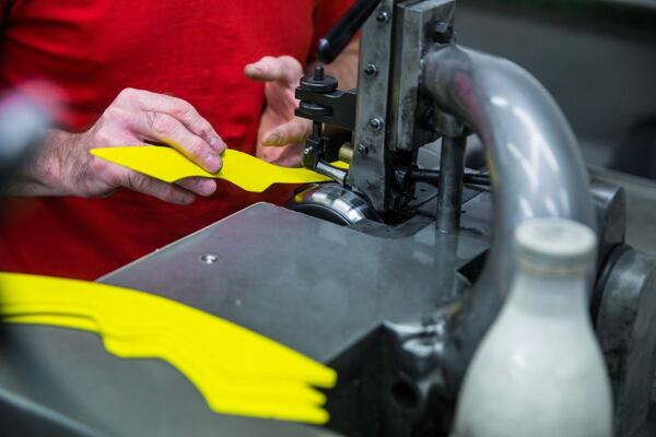 Zaměřme se teď na začátek výroby v šicí dílně. Prvním krokem na cestě k ušití lezečky je vysekání jednotlivých dílů z kůže (přírodní nebo syntetické) podél hran šablonovitě vypadajících nožů. Nože se položí na vybraný materiál a vyseknou se podle nich základní díly. Na jednu botu je třeba sedm, či víc přesně tvarovaných základních dílů svrchního materiálu.