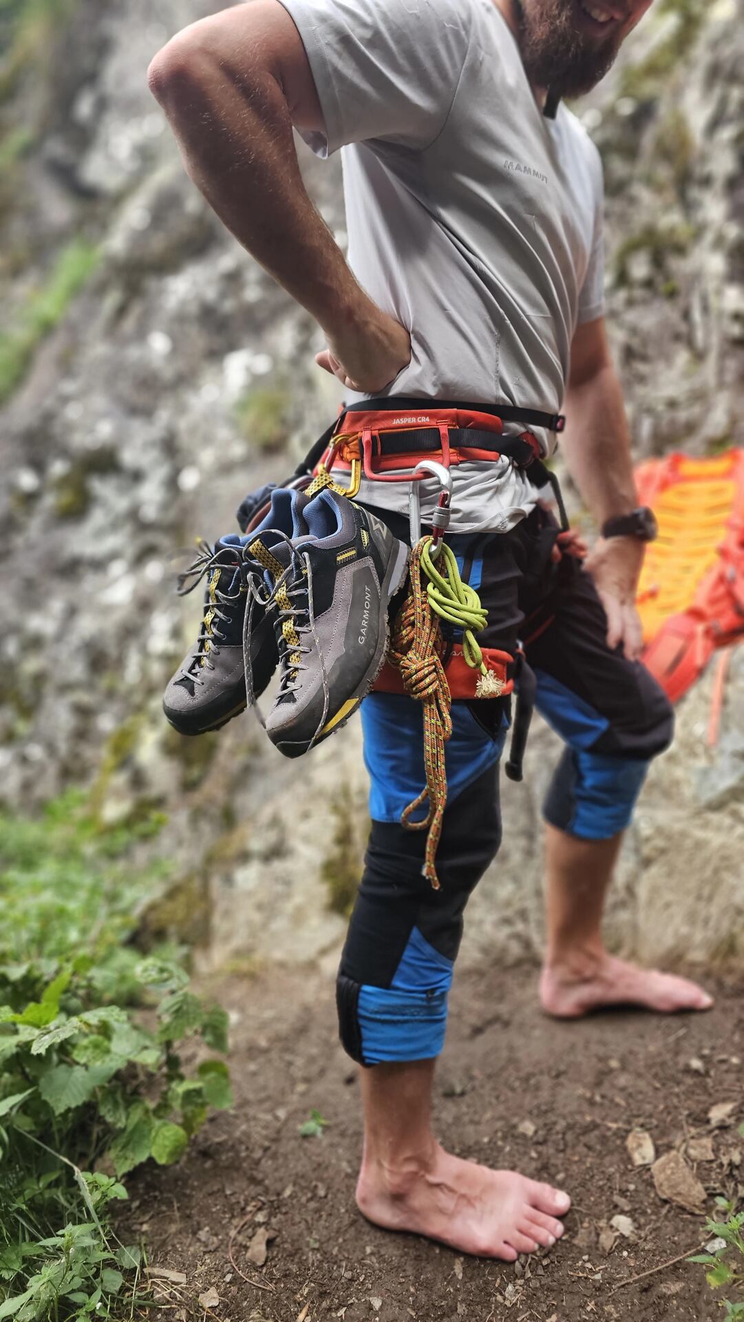 Boty při vícedélkovém lezení zavěsíte za poutka na sedák