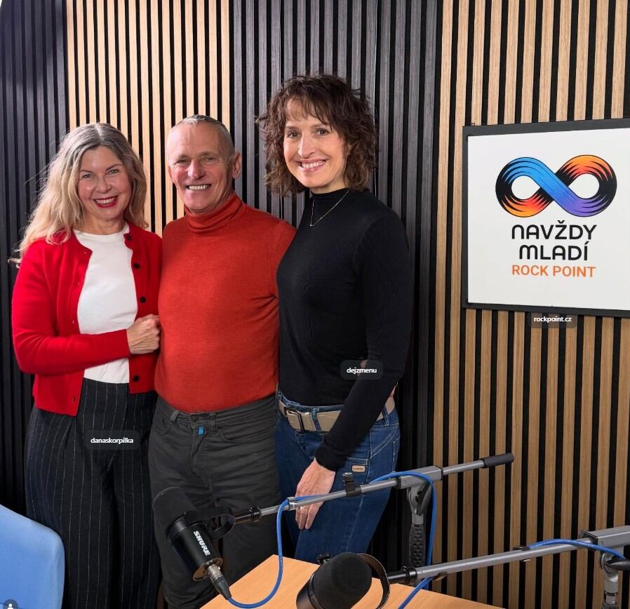 Dana a Miloš Škorpilovi s moderátorkou Markétou Chýňavovou ve studiu při natáčení podcastu Rock Point NAVŽDY MLADÝ