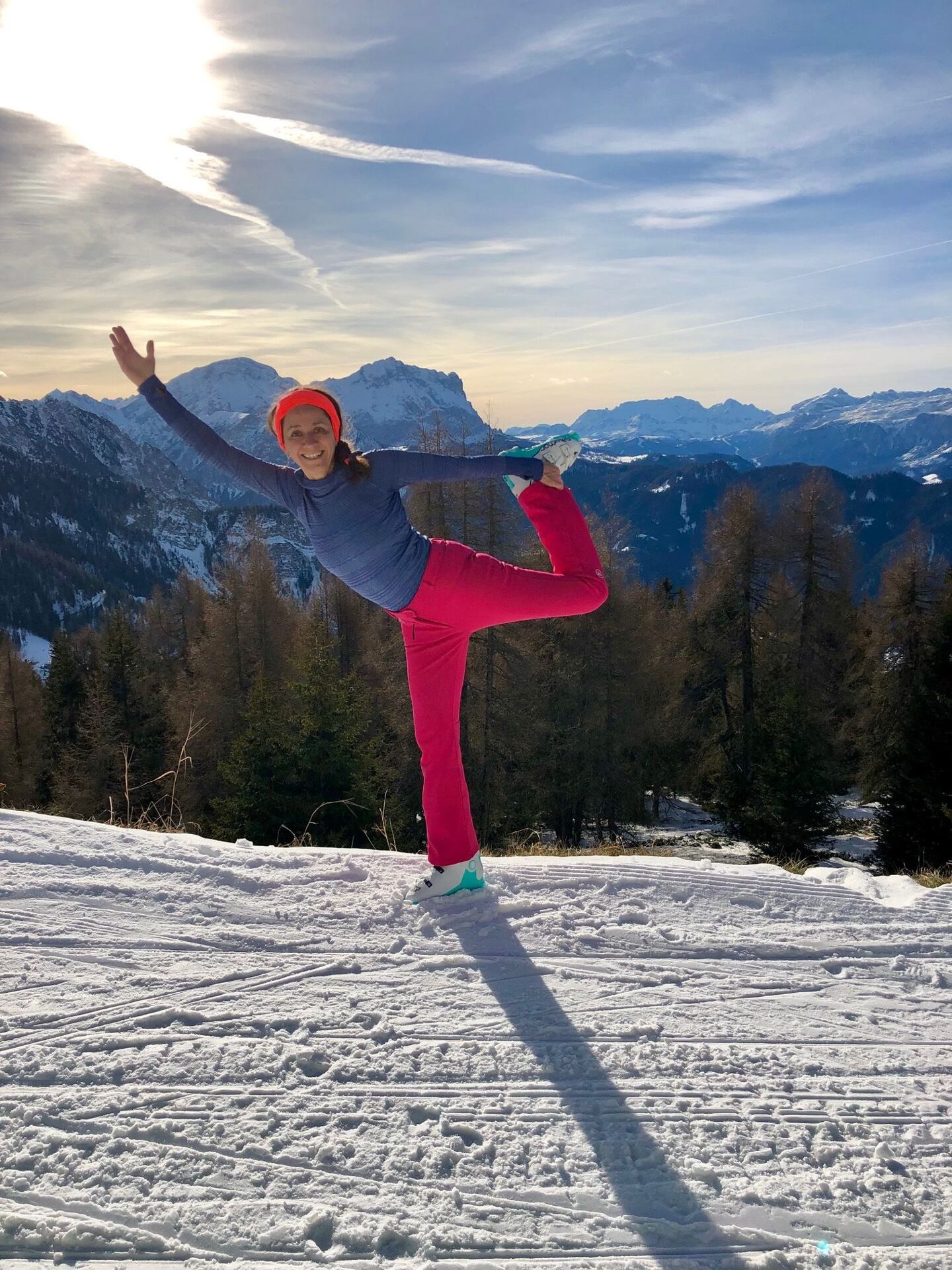 No a jak to mám já? Mé dny jsou všechny spojené s jógou, takže ani na lyžích se jí nevzdám. Vždy na začátku dne zlehka motivuji tělo, aby spolupracovalo v bezpečných rozsazích, v naladění na následující činnost a hlavně, aby se začalo zahřívat, ať nezavdám příčinu svalového zranění způsobeného zimou a zatížením.
