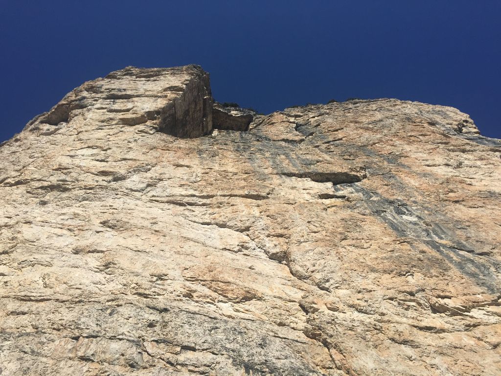 Po jedné straně nahoru na skalní věž (v pozadí Tre Cime z netradičního pohledu z druhé strany).