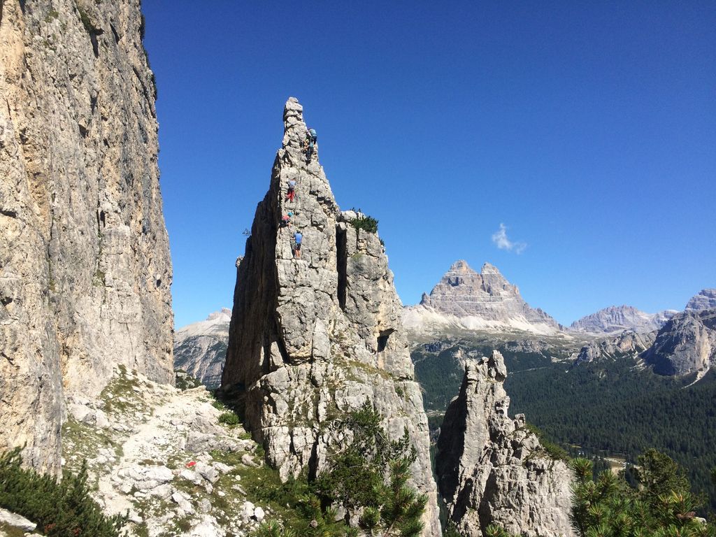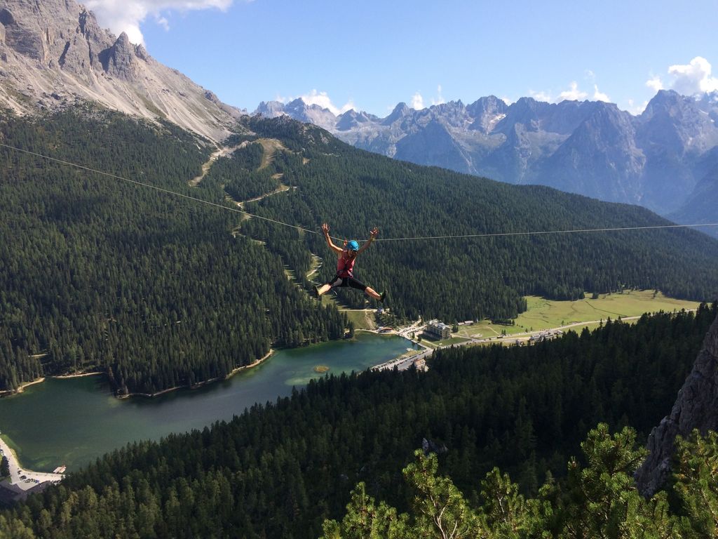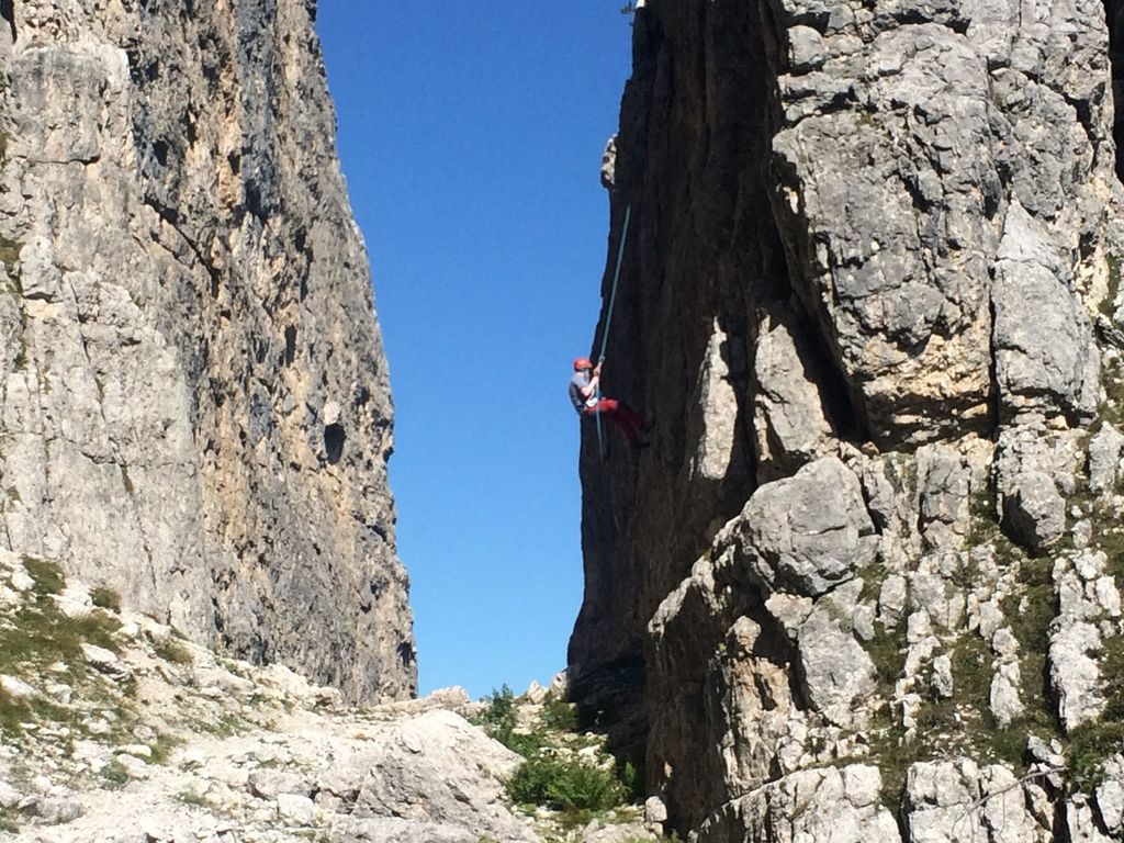Třetí den opět začínáme od jezera Braies. Tentokrát si otestujeme lezeckou výbavu přímo ve skalách. Terorie a opáčko bezpečnosti je nutností a všichni znovu povinně uzlujeme a zkoušíme. Je fajn si vše vyzkoušet u skály ještě dole. Poté, co mi vypadl kyblík (jistítko) z ruky, jsem alespoň na vlastní kůži zjistila, co dělat a že bych na stěně úplně v háji ještě nebyla. Ten den jsme si vyhráli docela dostatečně...
