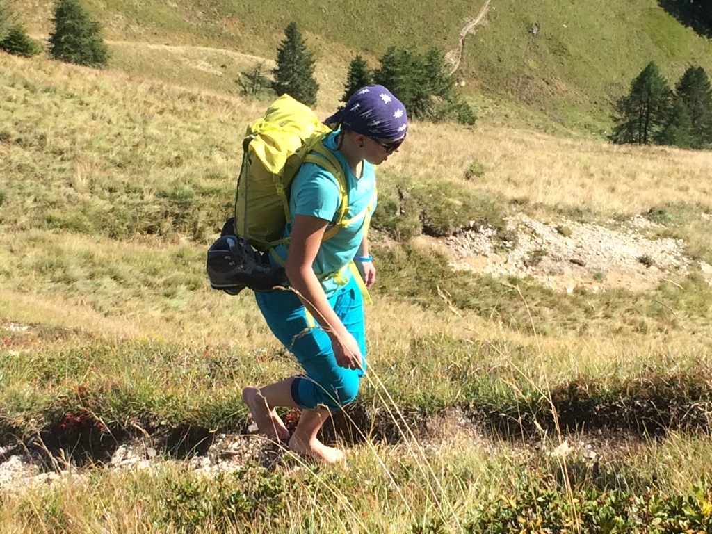 Po vzoru jednoho z guidů si Helča vyzkoušela chůzi naboso v měkkém terénu.