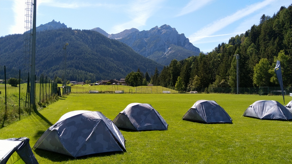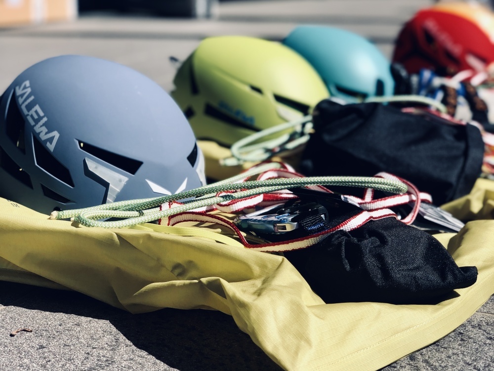Salewa bere školení poctivě a hned po příjezdu je na nás nachystaná. Každý máme připravenu svou hromádečku lezecké výbavy včetně batohu. Dámy navíc dostávají Salewa trika, aby ladily a společně ještě stavíme Salewa stany, které budou po dobu kempu naší střechou nad hlavou.