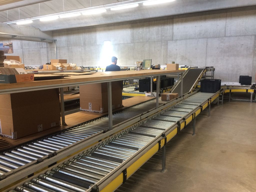 Automatizovaná linka, roboti na vyskladnění, vše je perfektně organizované.