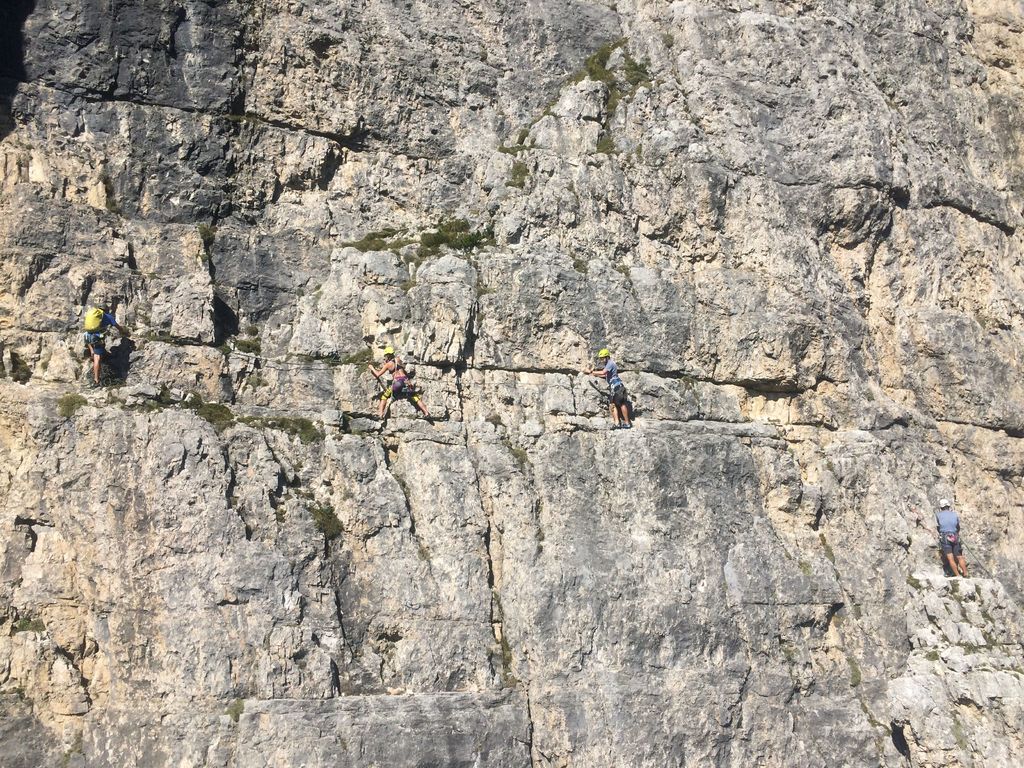 Čeká na nás i krátká ferrátka. Italští guidi za pomoci překladů Gaba Adamce (horského vůdce a šéfa zastoupení Salewy pro střední Evropu) nás provedou teorií bezpečnosti na ferratách a práce s ferratovým setem. Na vlastní kůži si osaháváme a testujeme lehkoučké a snadnoovladatelné karabiny, které skutečně činí zdolání této hravé ferrátky více komfortní.